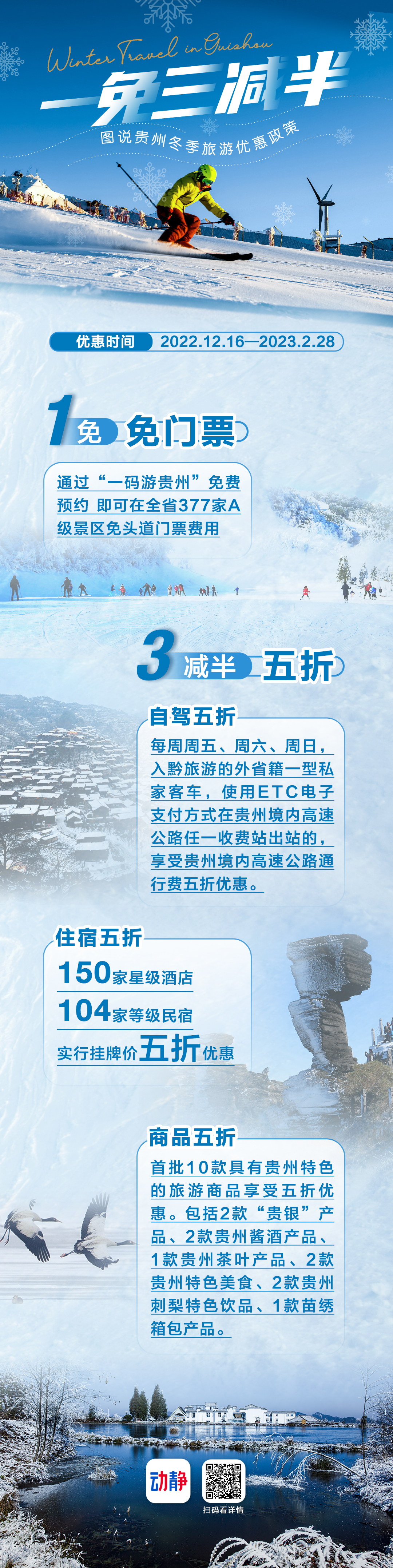 春赏花、夏避暑、秋风情、冬康养,多彩贵州四季都有醉人的魅力。眼下,冬游贵州正当时!冬游贵州,你可以登山赏雪亲近大自然;村寨寻冬,感受民族节庆欢乐;温暖过冬,尽享“泉世界”疗养;南方滑雪,感受运动激情飞扬;养身养胃,尝遍地道贵州味道。更何况,377家A级景区免头道门票,自驾、住宿、商品五折,超多优惠,你还等什么?