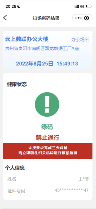 该场所码弹窗提示:根据贵阳市疫情防控相关规定,未持有72小时内核酸检测阴性证明,限制进入贵阳市公共场所。该类人员属于贵阳市规定需“三天一检”人员,无72小时内核酸检测阴性证明,不能进入贵阳市公共场所。