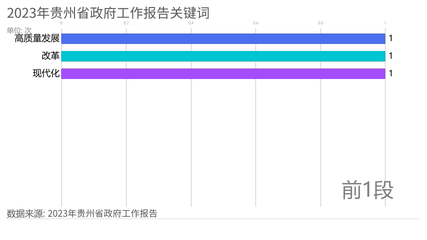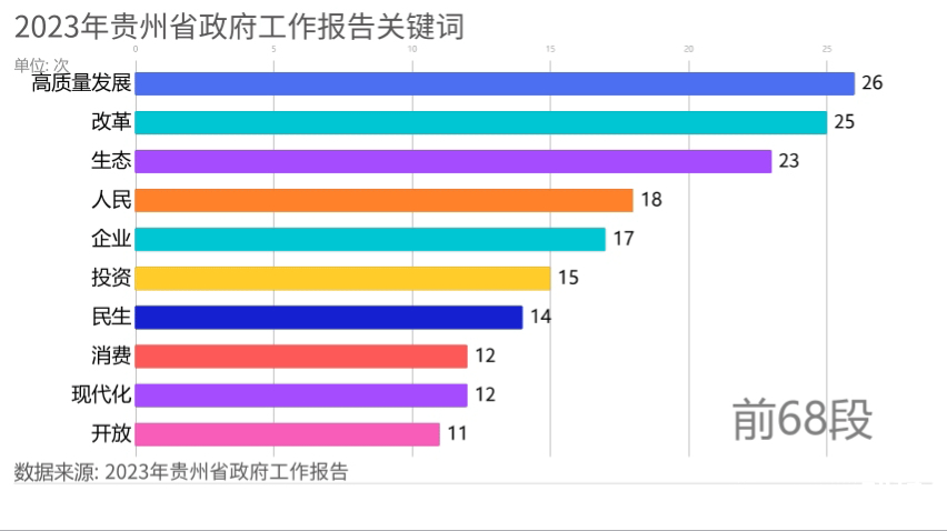 值得注意的是,除了“高质量发展”外,“改革”、“生态”等成为《报告》中累计出现次数较多的关键词,这也与贵州近年来的发展方向相符。如“改革”,新国发2号文件明确提出,贵州要建设西部大开发综合改革示范区,这其中涵盖了市场化配置改革、国企改革、宅基地改革等多项内容;又如“生态”,“守好生态和发展两条底线”,“打造生态文明建设先行区”,生态环境保护、产业生态化、生产产业化一直是贵州转变发展方式的重要举措。