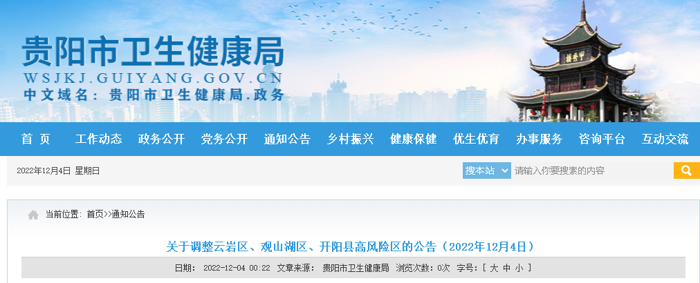 根据当前疫情防控形势,为快速有效阻断疫情传播,实现科学精准防控,切实保障辖区内群众生命安全和身体健康,按照《新型冠状病毒肺炎防控方案(第九版)》《关于进一步优化新冠肺炎疫情防控措施科学精准做好防控工作的通知》(联防联控机制综发〔2022〕101号)相关规定,经综合研判,自2022年12月4日起,将云岩区、观山湖区、开阳县部分高风险区调整为低风险区,现公告如下: