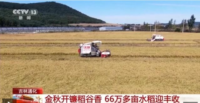 目前,吉林通化的66万多亩水稻进入了成熟期,稻田一片金黄,麦浪滚滚,收割机正在地里作业。今年,当地采取订单式的种植方式,加上统一育种、统一插秧、科学田管,提升了稻米的品质。据初步测算,今年通化市的水稻产量预计在40多万吨左右。