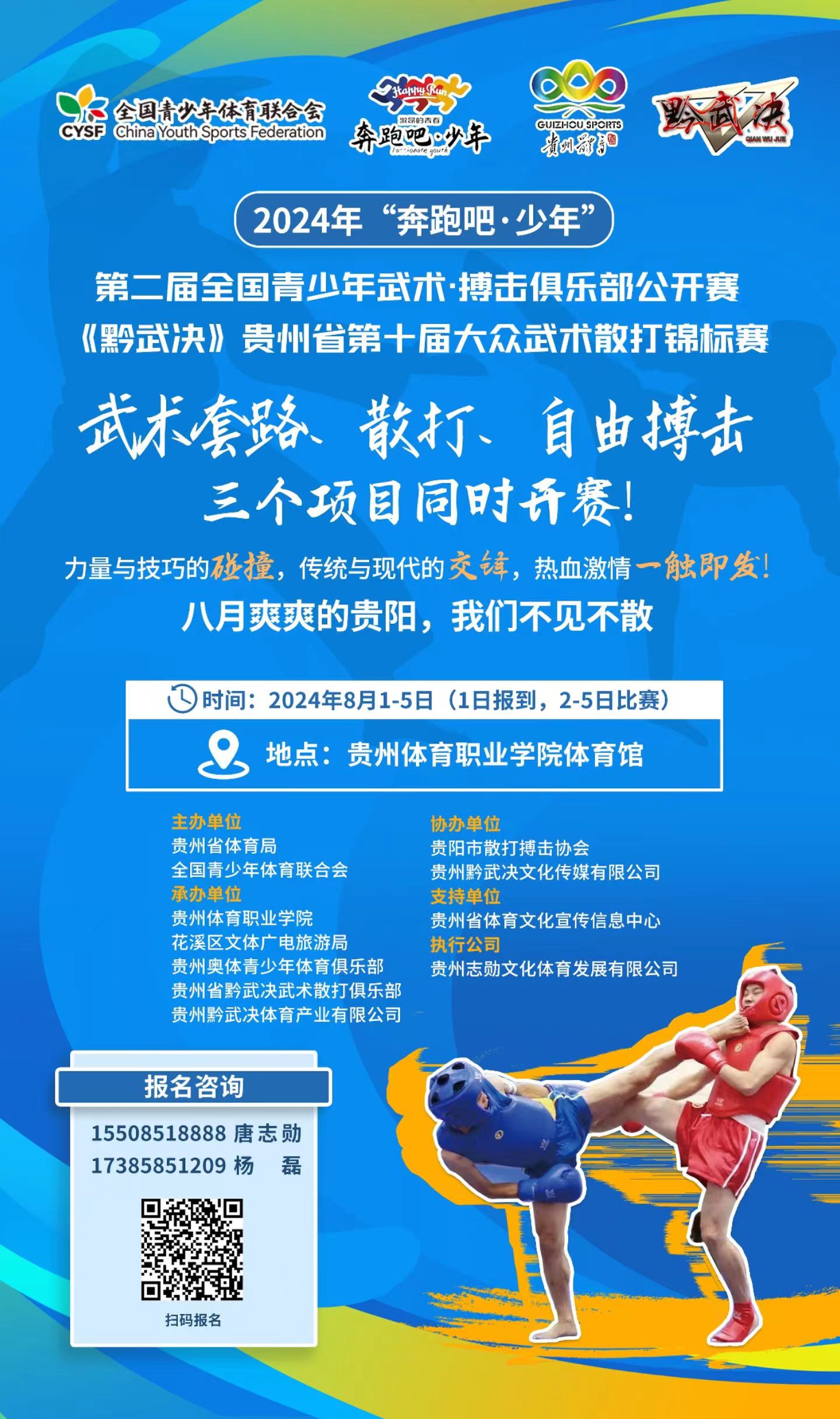2024年“奔跑吧·少年”第二届全国青少年武术·搏击俱乐部公开赛及《黔武决》贵州省第十届大众武术散打锦标赛将于8月1日—8月5日在贵州体育职业学院举办,届时武术套路、散打、自由搏击三个项目将同期开赛,一场场力量与技巧的碰撞、传统与现代的交锋将精彩上演,赛事报名通道已于7月5日开启,大家可以扫描文末图片二维码进行报名,报名通道将于7月22日关闭,预计赛事规模超3000人。