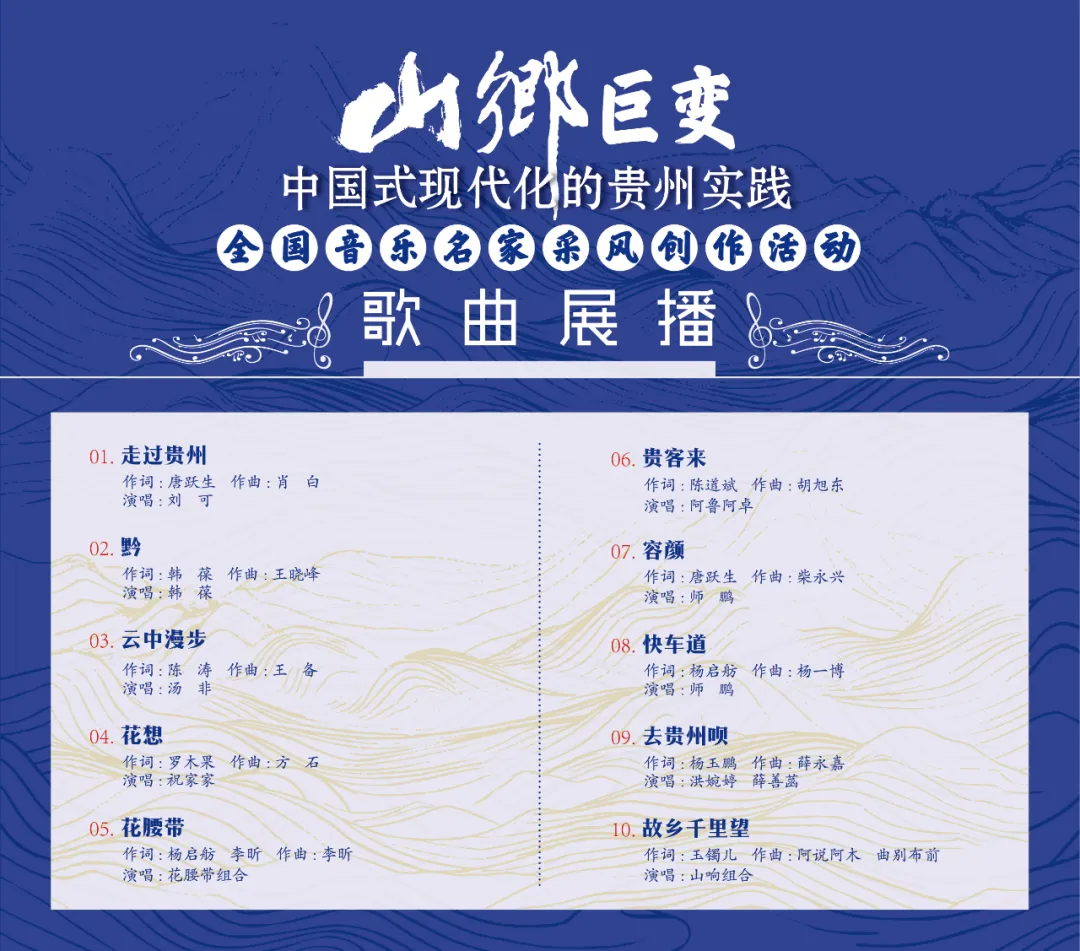 为深入贯彻党的二十大精神和习近平文化思想,推动多彩贵州文化强省建设,在中国文联指导下,中共贵州省委宣传部、中国音乐家协会、贵州省文学艺术界联合会联合组织了“山乡巨变——中国式现代化的贵州实践”全国音乐名家大型采风创作活动,全国音乐名家深入贵州的丹寨、从江和黔西等市县采风,音乐名家们感受其巨变之震撼,体验其民风之淳朴,汲取传统之精髓,融合时代之元素,将亲眼所见的贵州美景、亲身体验的贵州风情,转化为一句句动人的歌词、一段段优美的旋律,创作出一批既具民族特色又富时代气息的歌曲,唱响贵州山乡巨变的颂歌。昔日之贵州“连峰际兮,飞鸟不通”,今日之贵州经济兴、百姓富、生态美。这些歌曲或激昂慷慨,或婉转悠扬,或古朴典雅,或时尚前卫,无不凝聚着音乐家们的智慧与心血,展现着中国文化的独特魅力,书写和记录着贵州的自然风光与人文风情,也记录着贵州在经济、社会、文化、交通等各方面的巨大变迁,展现了贵州在新时代背景下的蓬勃发展。为集中推广、宣传这批优秀作品,唱响时代主旋律,讲好中国式现代化的生动故事,凝聚奋进新征程、建功新时代的信心和力量,7月19日,在中国文联举行了首发仪式,现对这组歌曲进行逐一展播。