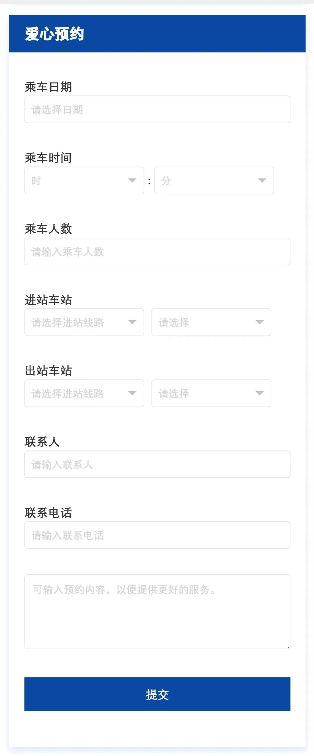 步骤3:跳转到“爱心预约”页面后,输入“乘车日期、乘车时间、乘车人数、进站车站、出站车站、联系人、联系电话、备注”等信息,点击“提交”。提交预约信息后,将有工作人员与您联系。