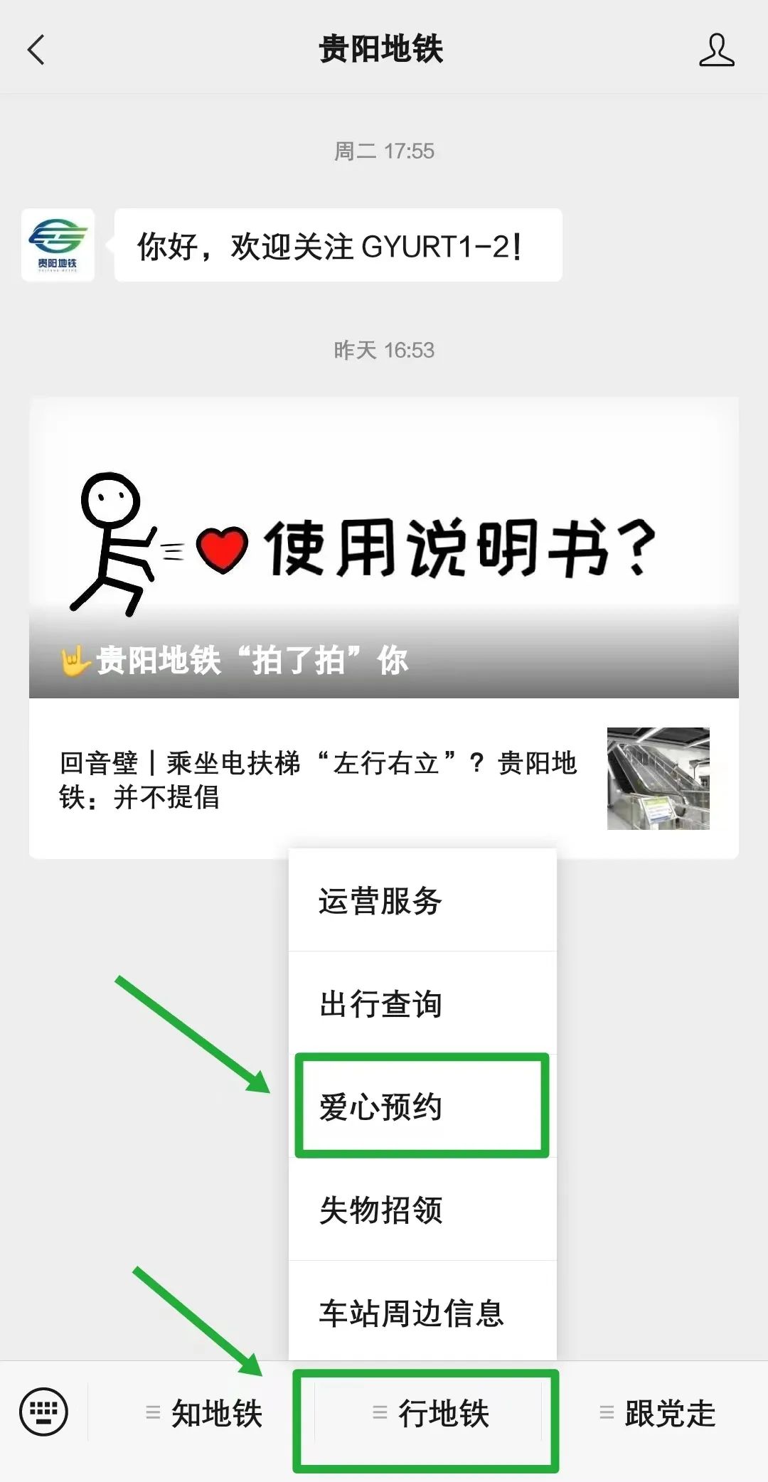 关注“贵阳地铁”微信公众号,点击底部菜单栏中的“行地铁”,选择“爱心预约”栏目进行预约。