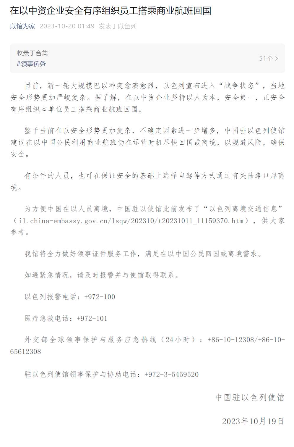 2023年10月19日,中国驻以色列使馆发布《在以中资企业安全有序组织员工搭乘商业航班回国》,全文如下: