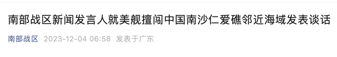 南部战区新闻发言人田军里空军大校表示,12月4日,美“吉福兹”号濒海战斗舰未经中国政府批准,非法闯入中国南沙仁爱礁邻近海域,中国人民解放军南部战区组织海上兵力全程跟监警戒。美蓄意搅局南海,严重侵犯中国主权和安全,严重破坏地区和平稳定,严重违反国际法和国际关系基本准则,充分说明美是南海和平稳定的最大威胁。中国对南海诸岛及其附近海域拥有无可争辩的主权,战区部队时刻保持高度戒备状态,坚决捍卫国家主权安全和南海地区和平稳定。