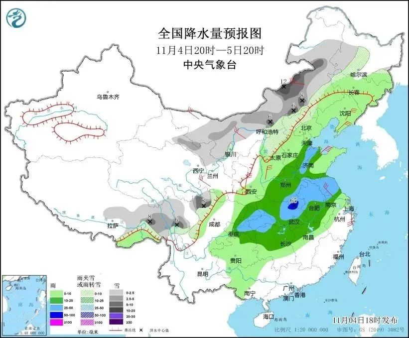 预计11月4日夜间至6日,我国中东部部分地区有中到大雨(雪)或雨夹雪,其中,5日至6日,内蒙古中部和东南部、吉林中西部、黑龙江中东部、辽宁中西部、河北北部等地有暴雪,局地大暴雪或特大暴雪;辽宁东部、吉林东部、黄淮、江淮、江汉、江南等地有中到大雨,局地暴雨,部分地区伴有雷暴大风和短时强降水。