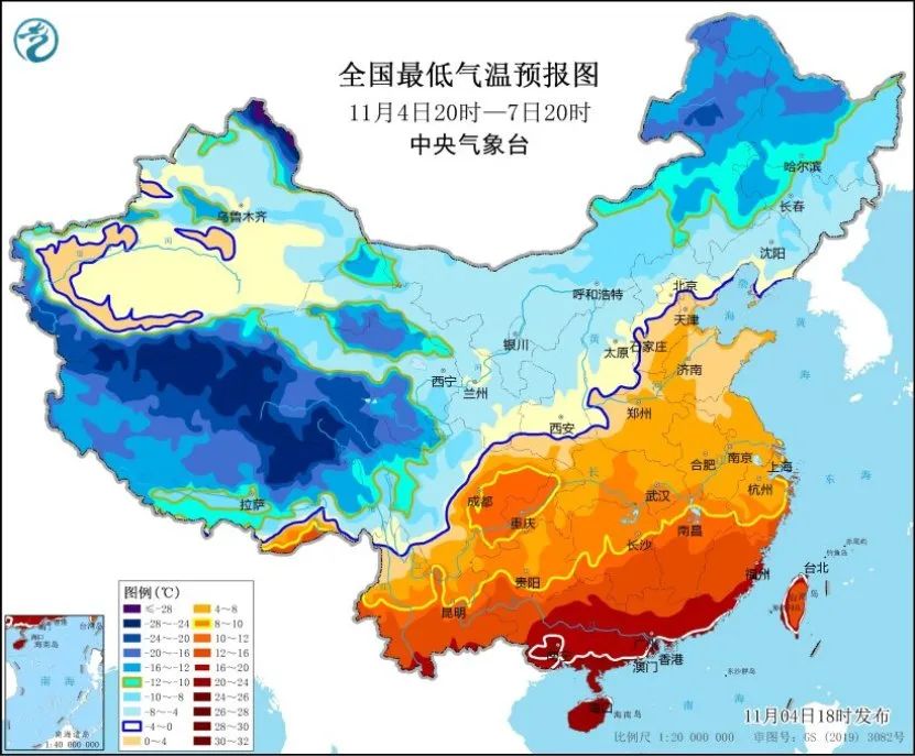 受强冷空气影响,预计,11月4日20时至11月7日20时,西北地区中东部及我国中东部大部地区气温将下降6~10℃,其中,内蒙古中部和东部、东北地区中南部、江淮中东部等地部分地区气温将下降12~14℃,吉林西南部、辽宁西北部、内蒙古东南部等地局地降温可达16℃以上;最低气温出现在7日早晨,最低气温0℃线将位于河北北部、北京南部、山西南部至陕西关中平原、甘肃东南部一带,长江中下游沿江大部地区最低气温将降至10℃左右。长江中下游以北地区有4~6级偏北风,阵风7~9级,局地可达10级;5日至6日,渤海、黄海、东海等海域有6~8级风,最大阵风9~10级。