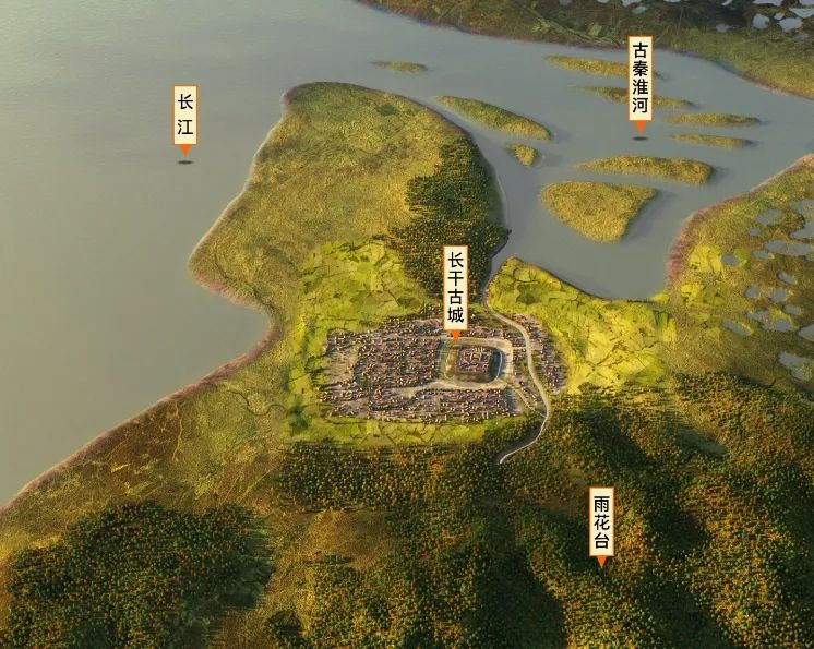 长干,是南京最早的地名。“长干古城”由一处中心台地以及台地外围环壕、墙基与门道、水井、猪祭祀坑等与筑城有关的遗迹组成。先民利用中心台地筑城,外有长江、秦淮河、花露岗、雨花台、赤石矶等江河与岗阜为天然屏障,具有强烈的军事要塞性质。台地外围多道不同时代环壕的发现,提供了古城不断使用和修筑的证据。