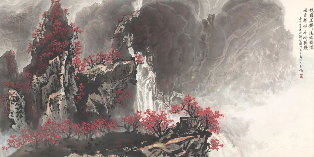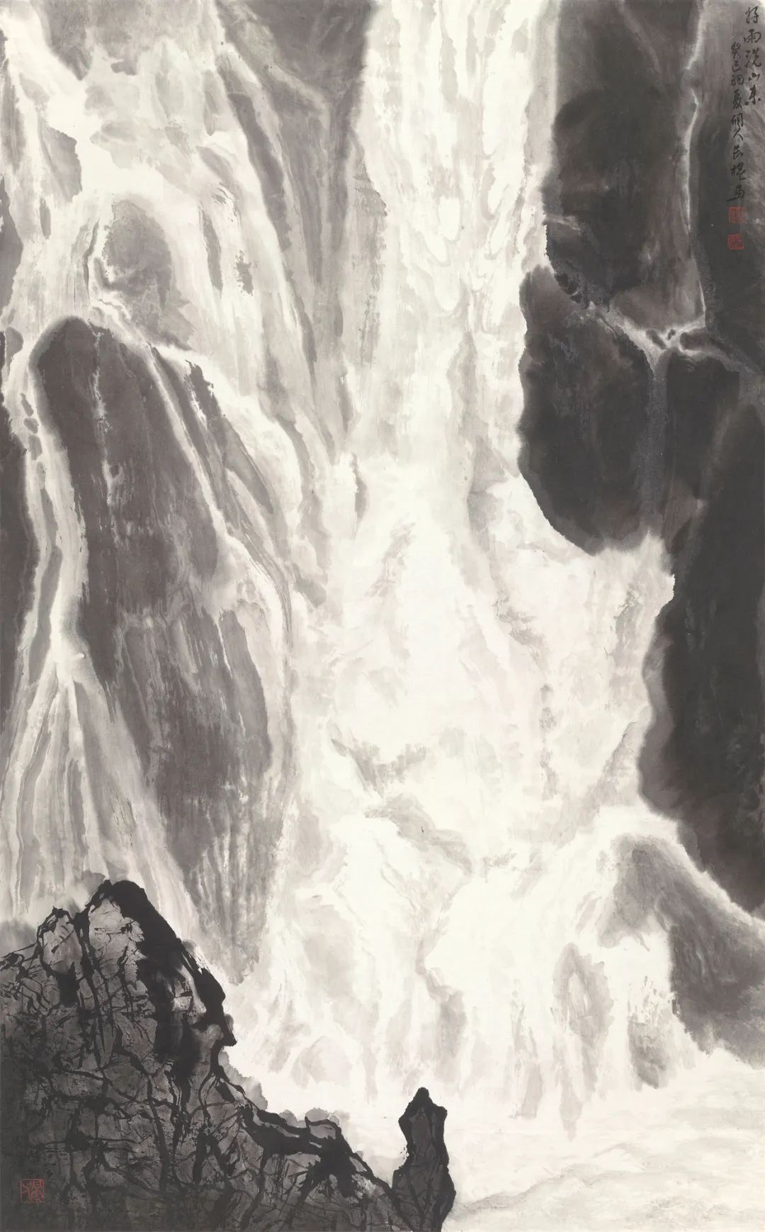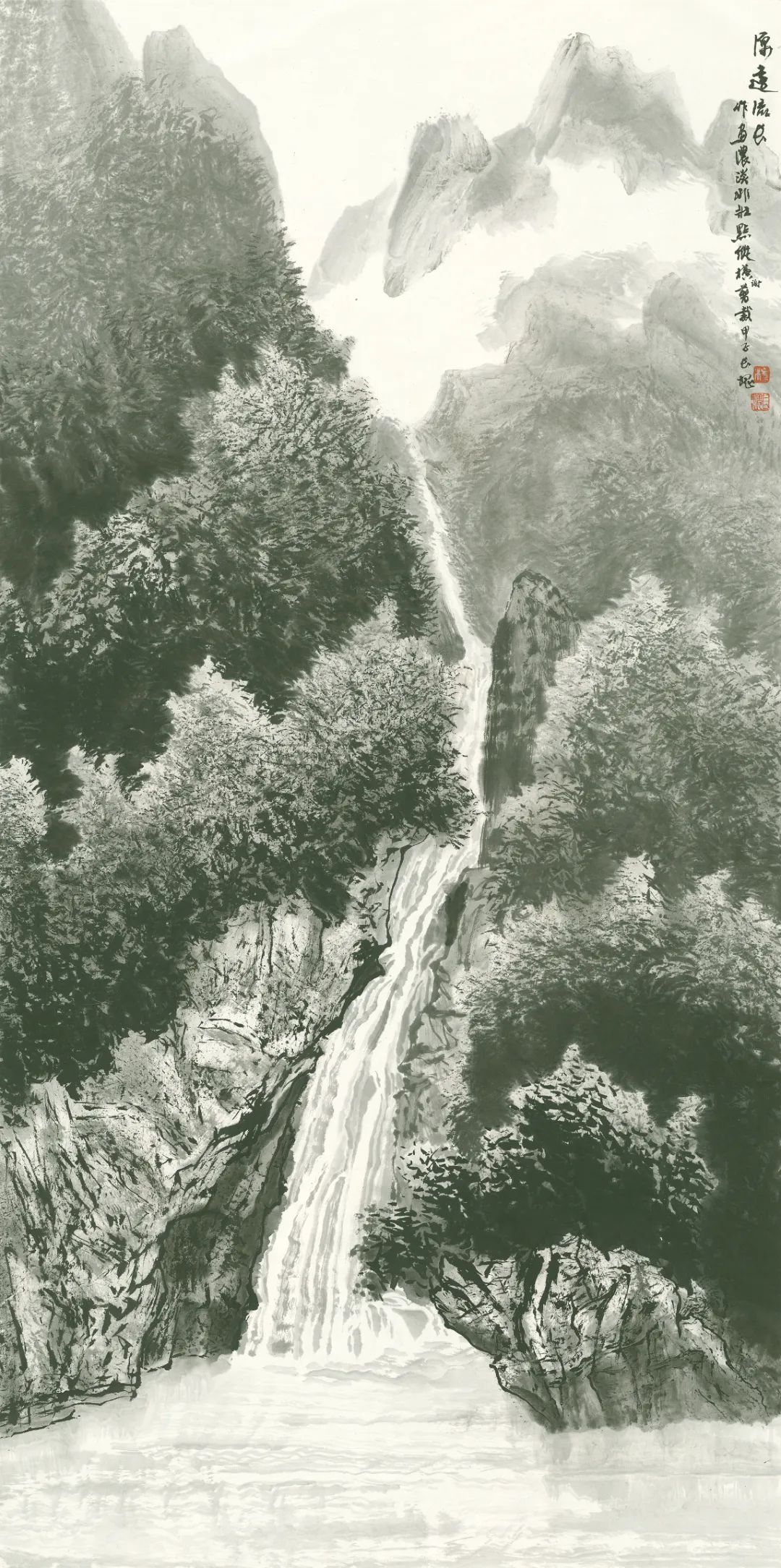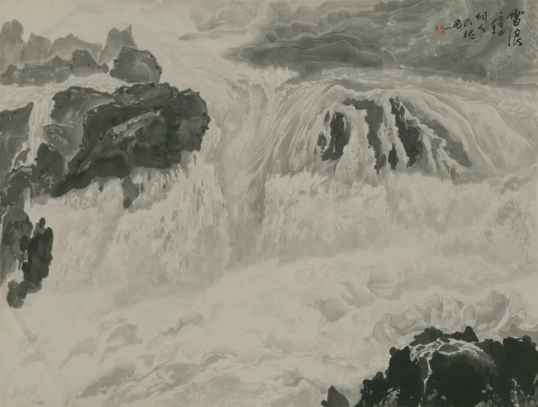 纵观中国绘画体系中画水的传统,古有马远《水图》十二幅,以各种丰富的技法表现水的动态,或宁静、或迂回、或汹涌、或崩腾……,近有黄君璧、陆俨少、关山月等名家表现飞瀑激流之法……,长槐先生所作飞瀑激流,风格别具,自成一家。他既注重对传统的研究与继承,又注重对家乡瀑布的精察体验。先生画水,顺水势而为,写中有皴,皴中带写,在书写中以淡墨的微妙变化表达奔腾的飞瀑激流,波涛汹涌、银浪翻腾,瀑布的神采与气势被表现的淋漓尽致。这种画法在中国山水画的历史上极为少见。长槐先生第一次把瀑布画出了自己的风格,丰富了中国山水画体系中水的表现技法,第一次把贵州瀑布带进了中国山水画的系统,这恰恰是长槐先生艺术成就最闪耀之处。