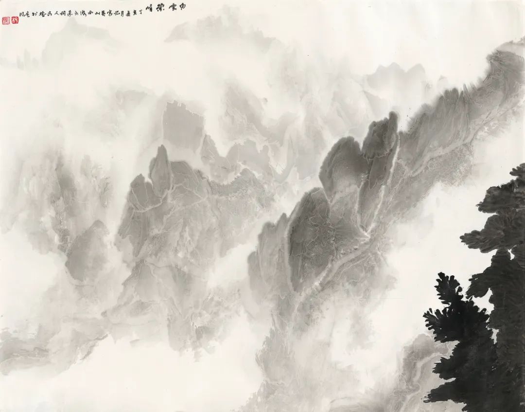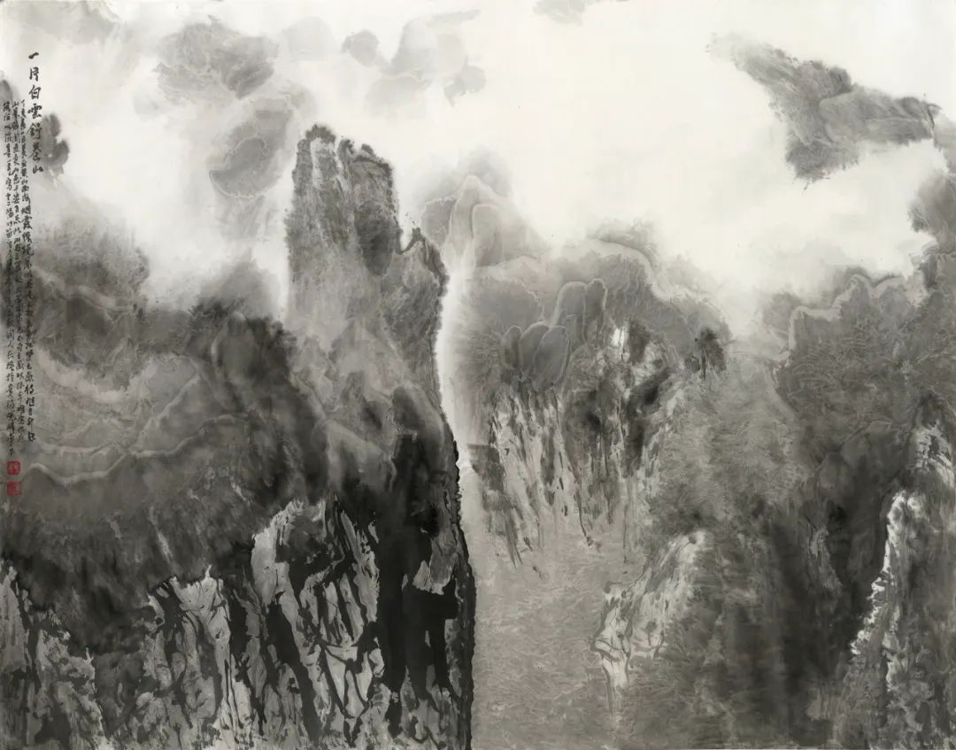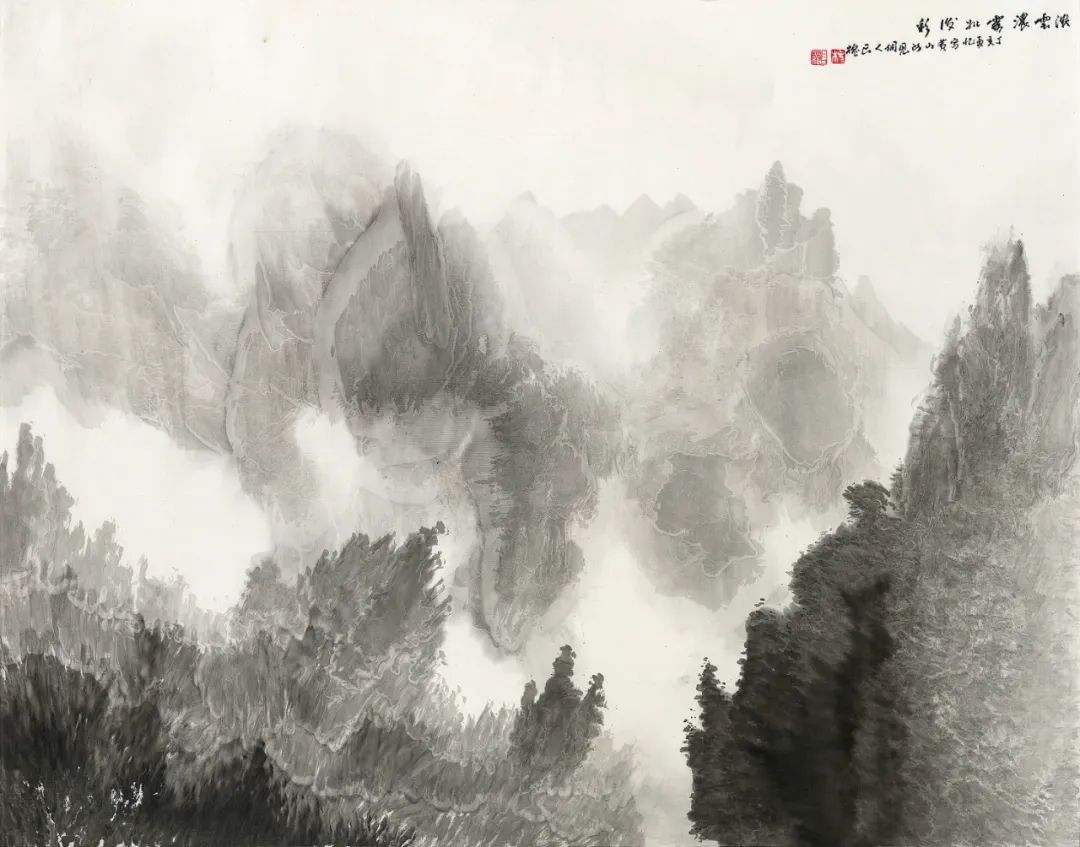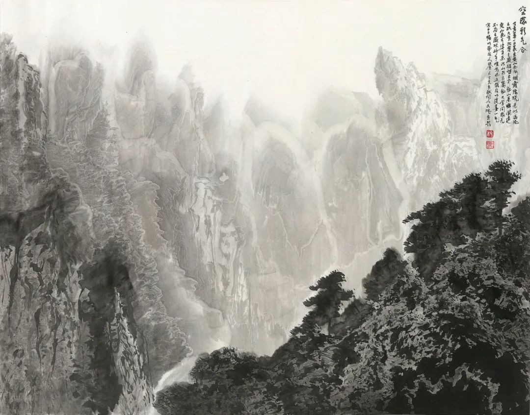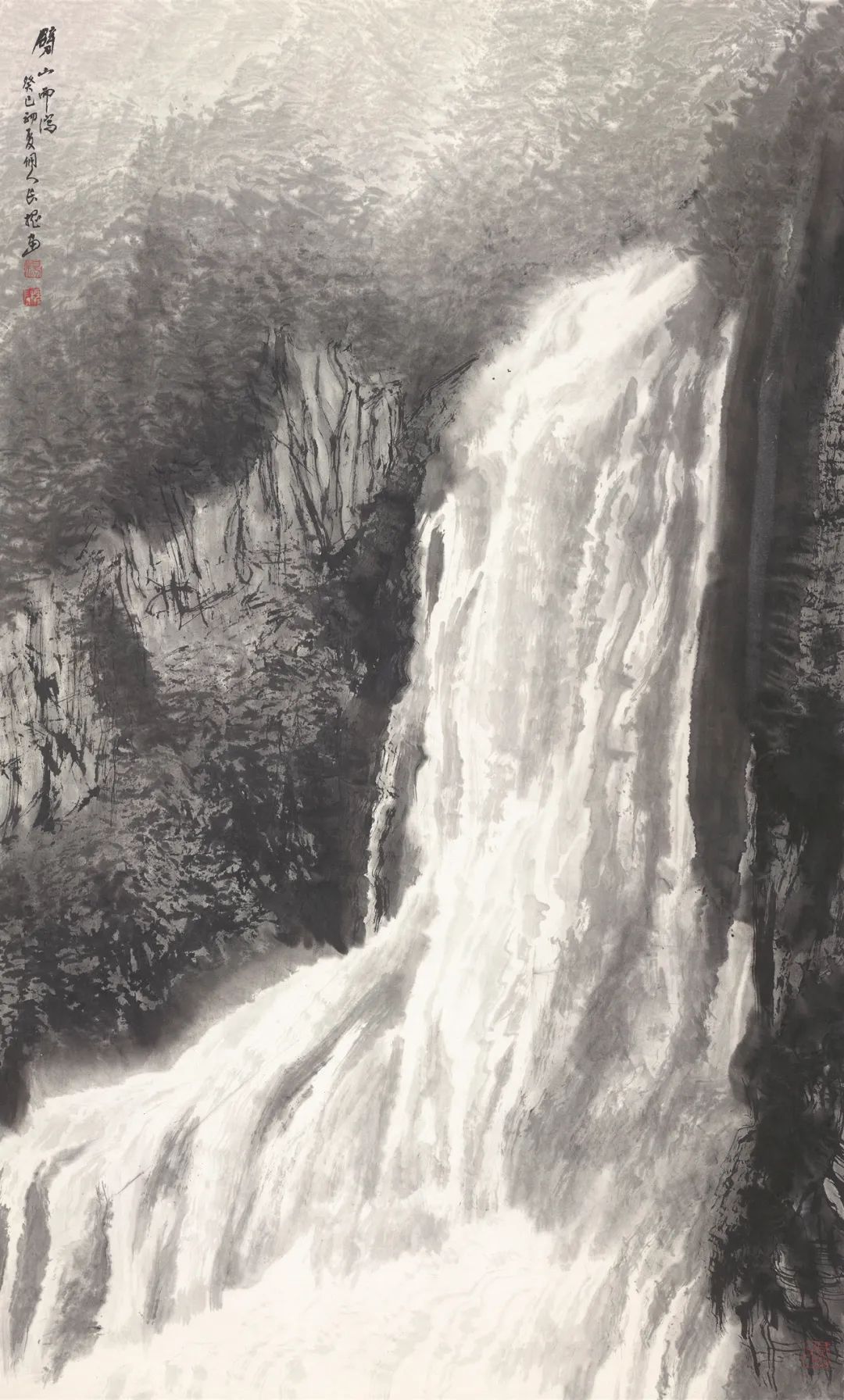 纵观中国绘画体系中画水的传统,古有马远《水图》十二幅,以各种丰富的技法表现水的动态,或宁静、或迂回、或汹涌、或崩腾……,近有黄君璧、陆俨少、关山月等名家表现飞瀑激流之法……,长槐先生所作飞瀑激流,风格别具,自成一家。他既注重对传统的研究与继承,又注重对家乡瀑布的精察体验。先生画水,顺水势而为,写中有皴,皴中带写,在书写中以淡墨的微妙变化表达奔腾的飞瀑激流,波涛汹涌、银浪翻腾,瀑布的神采与气势被表现的淋漓尽致。这种画法在中国山水画的历史上极为少见。长槐先生第一次把瀑布画出了自己的风格,丰富了中国山水画体系中水的表现技法,第一次把贵州瀑布带进了中国山水画的系统,这恰恰是长槐先生艺术成就最闪耀之处。