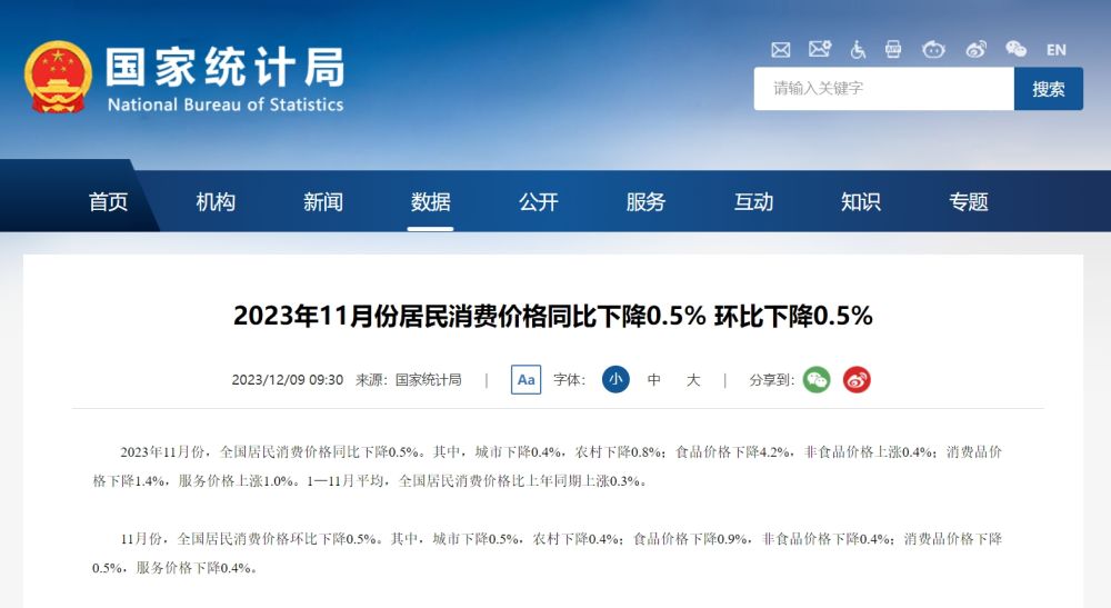 2023年11月份居民消费价格同比下降0.5% 环比下降0.5%
