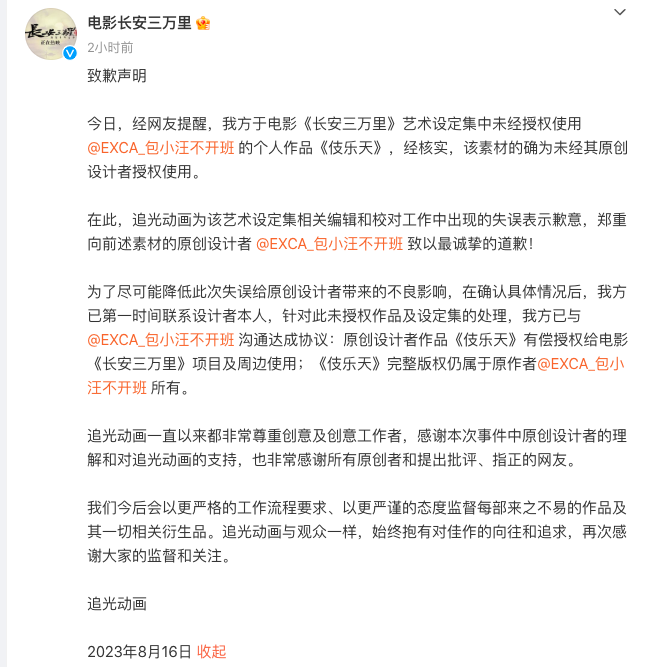 声明称,经网友提醒,电影《长安三万里》艺术设定集中未经授权使用@EXCA_包小汪不开班 的个人作品《伎乐天》,经核实,该素材的确为未经其原创设计者授权使用。