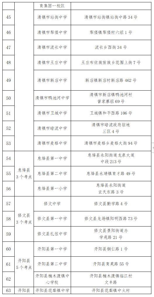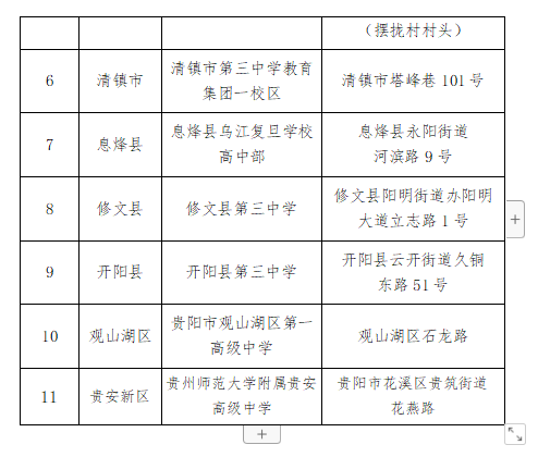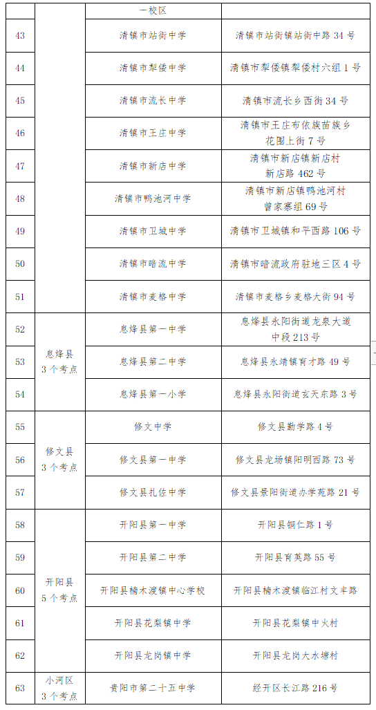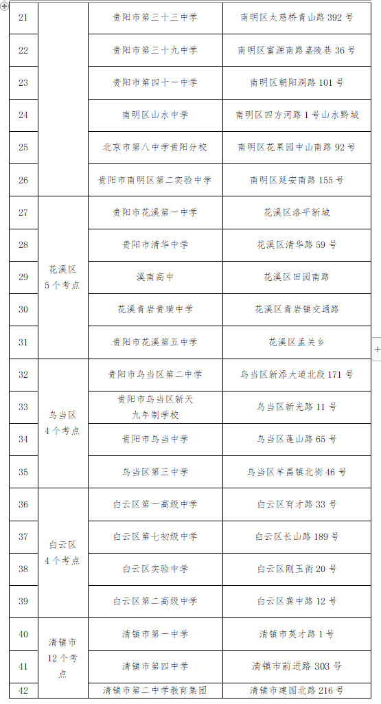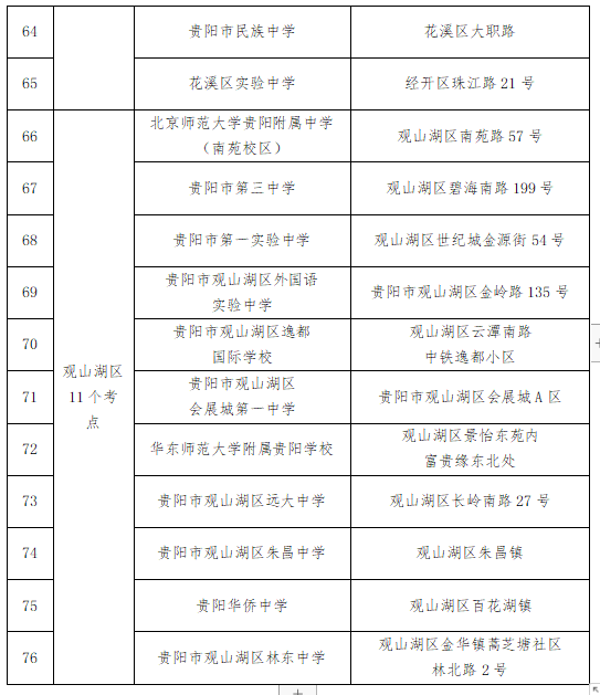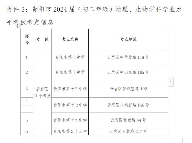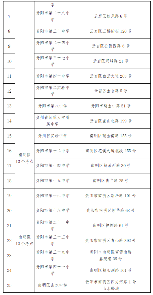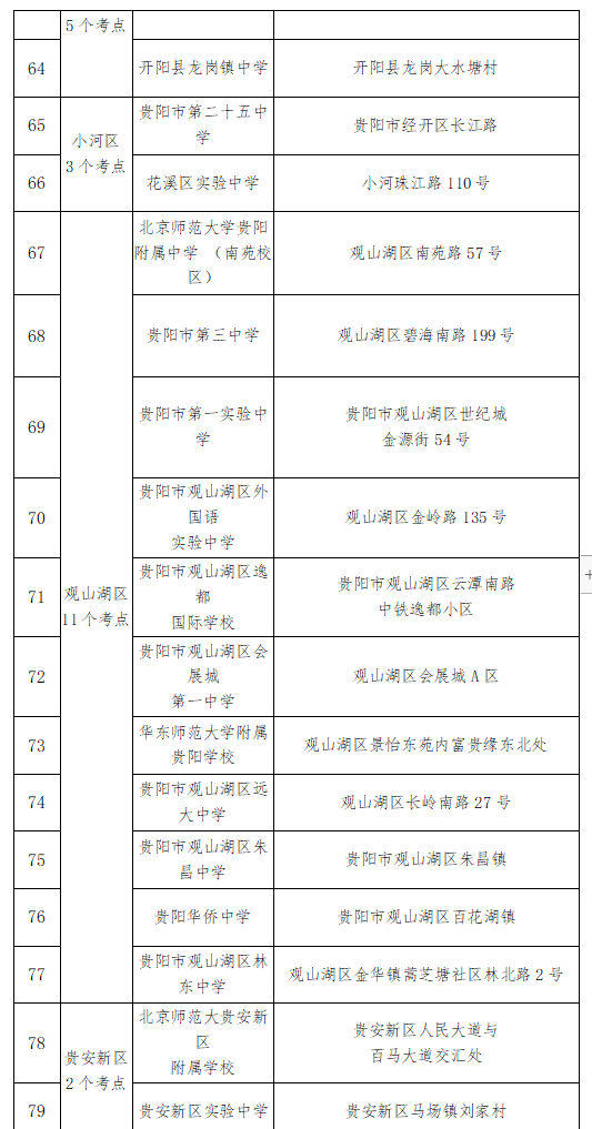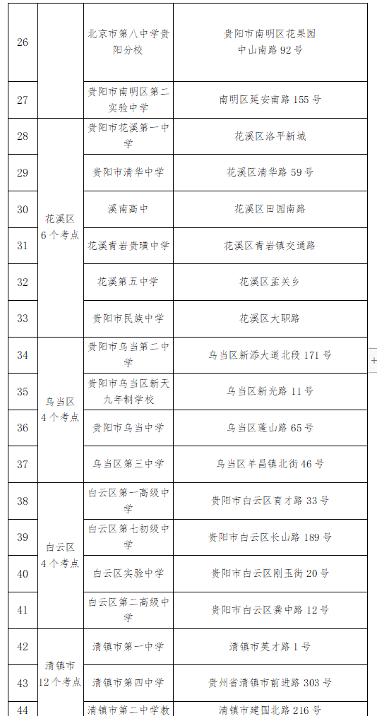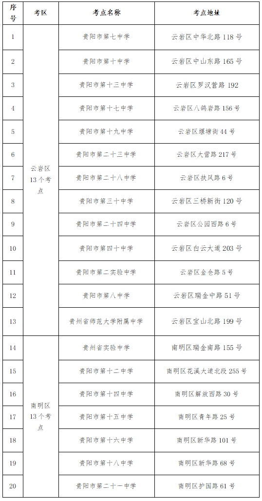从贵阳市的考点分布来看, 中考以及初二年级地理、生物学科学业水平考试(合卷考试)涉及云岩区、南明区、乌当区、经开区、白云区、花溪区、观山湖区、清镇市,修文县,开阳县,息烽县、贵安新区共12个考区,其中考点主要集中于云岩区、南明区、观山湖区、清镇市,主要涉及的道路有中华北路、中山东路、八鸽岩路、扶风路、瑞金中路、宝山北路、瑞金南路、新华路、护国路、富源南路、延安南路、新添大道北段、长山路、刚玉街、英才路、前进路、建国北路、长江路、碧海南路、北京西路等。