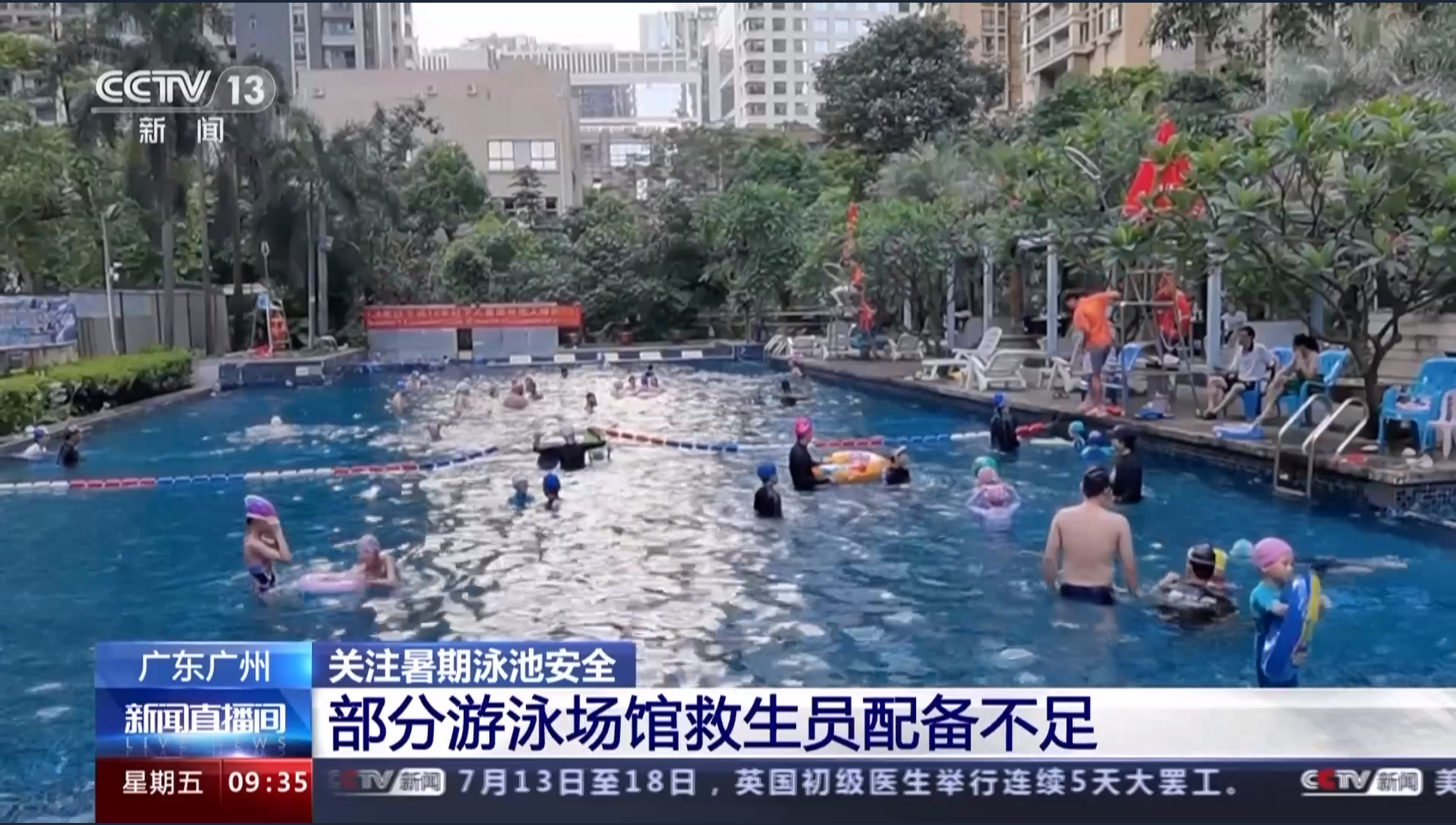 7月9日下午,广州市气温达到35℃,市区内各大游泳场所人头攒动。位于广州某小区内的游泳池,在游泳高峰时段,泳池内大约有40位泳客在游泳。该泳池面积约600平方米,根据游泳场所的国家标准,该泳池应当至少配备4名救生员。但记者却发现,现场只有两名救生员在岗工作,另外两个救生岗则空无一人。