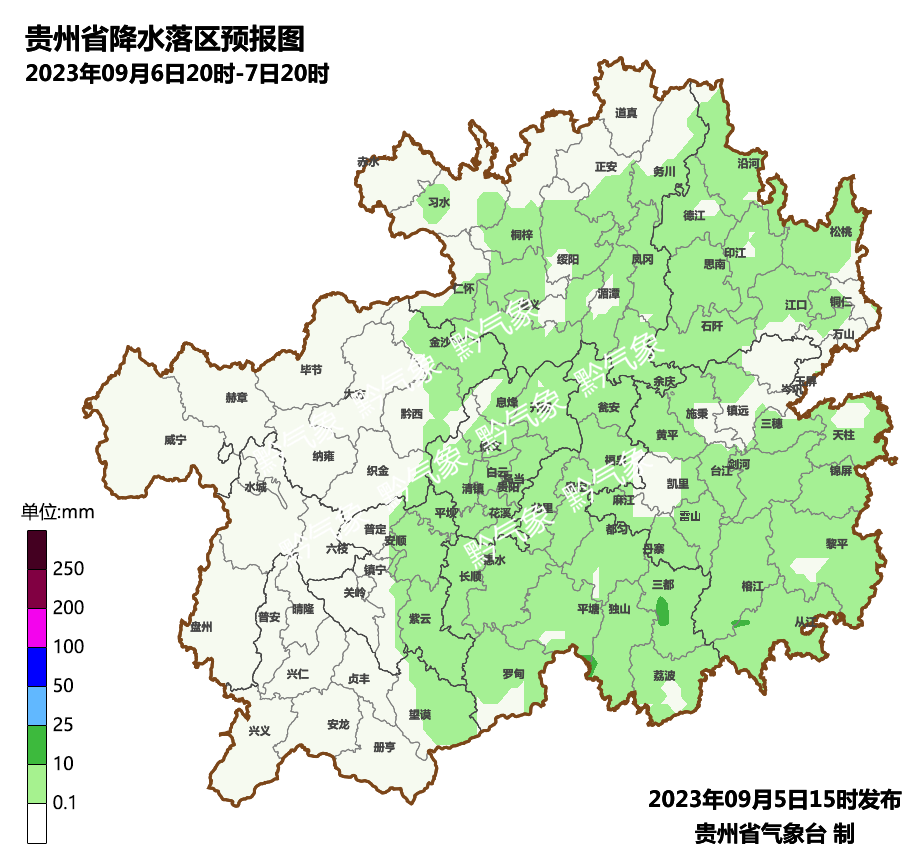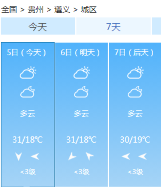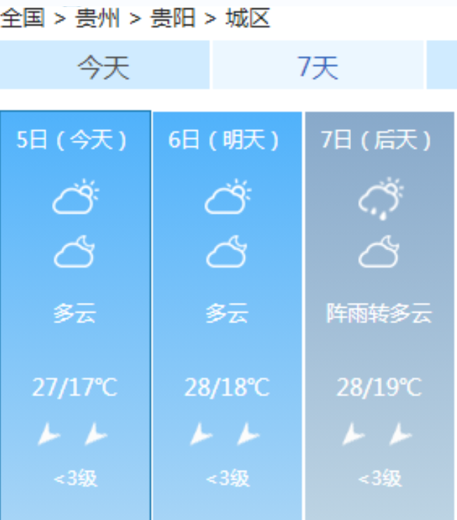 今天夜间到明天白天,全省多云到晴,南部边缘个别县市及赤水河谷有35℃以上的高温天气;