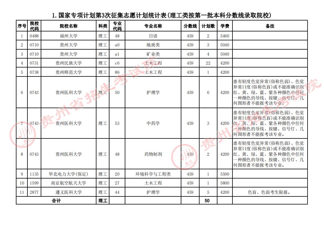 附:1.国家专项计划第3次征集志愿计划统计表(理工类按第一批本科分数线录取院校)