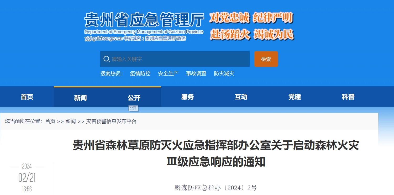 记者从贵州省应急管理厅官网获悉,根据贵州省森林防火工作电视电话会议精神和当前贵州省森林火灾形势,按照《贵州省森林火灾应急预案》有关规定,贵州省森林草原防灭火应急指挥部办公室决定于2月21日6时启动森林火灾Ⅲ级应急响应。