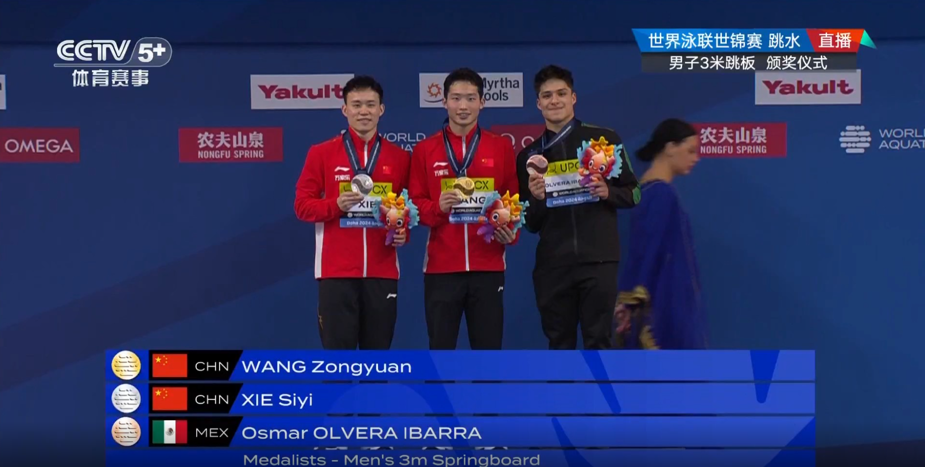 北京时间2月8日,世界泳联锦标赛跳水男子3米板决赛,中国选手包揽冠亚军。王宗源538.70分获得冠军,完成世锦赛该项目的三连冠。另一名中国选手谢思埸以516.10分的成绩,获得亚军。