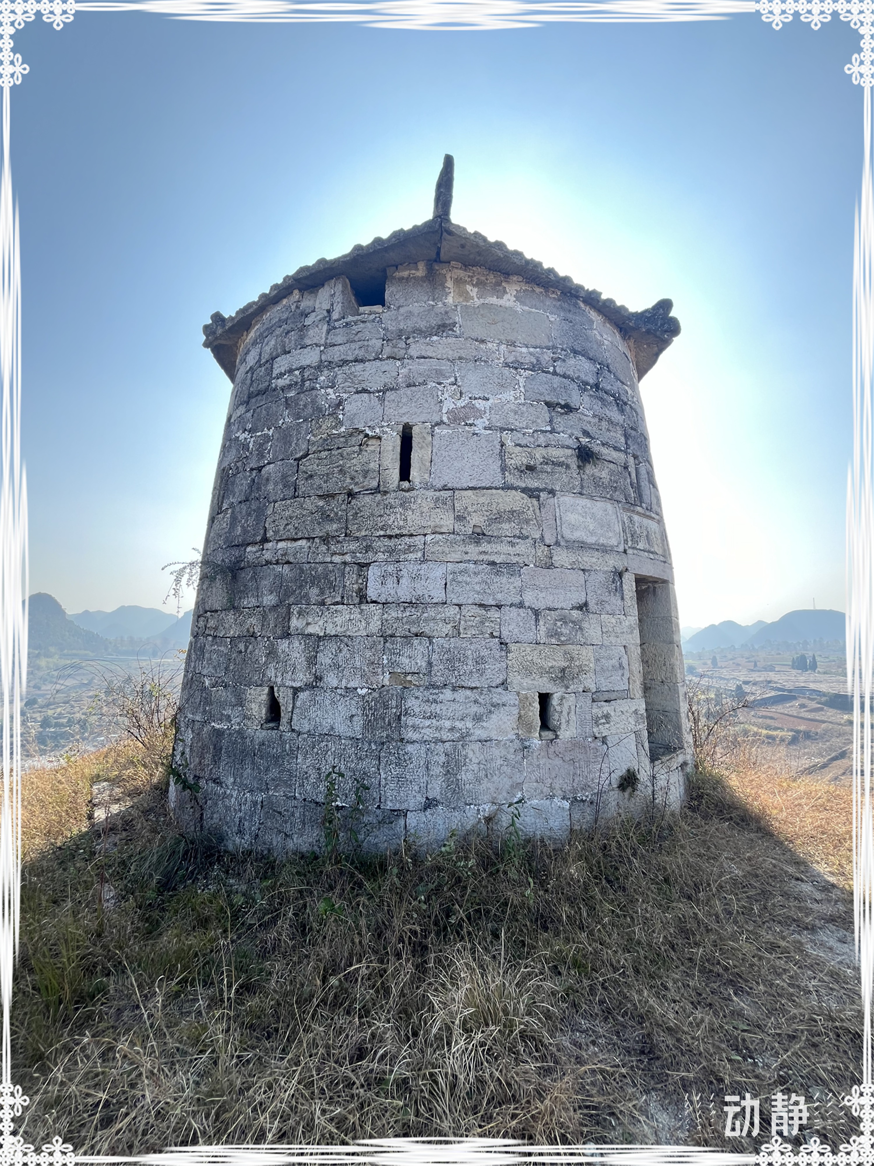 安龙城南,有东西两山所依,东为龙井山,西为桅杆山,乾隆年间南笼知府杨汇修建的安龙城垣,便“盘罗龙井、桅杆二山之腰”。今天,山腰城垣还残存一些断壁,但龙井山巅其中一个峰头矗立的碉楼,保存完好。碉楼为青石砌,楼体为圆柱形,直径4米,通高6米。楼顶为石梁砌筑的六角攒尖顶,上铺石片。碉门亦为青石砌,竖长方形,高1.6米,宽0.8米。碉壁一周共砌开口20个,大致分为上中下三排,上排为瞭望孔,中、下排为射击孔。这些开孔均为内宽外窄,防止从外面射击打到守卫。碉楼的作用主要是瞭望放哨,修建在山巅,安龙城垣内外一览无遗。