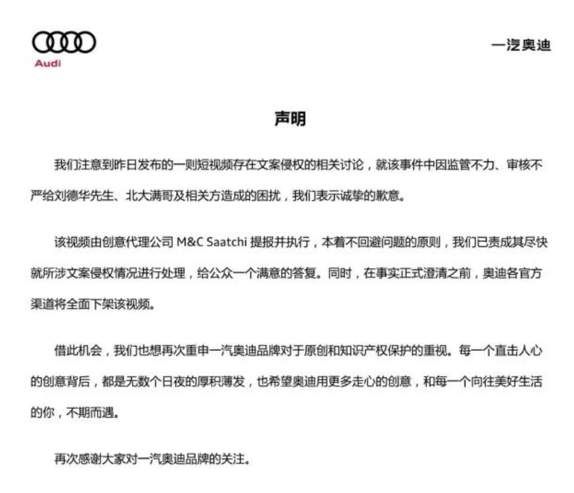 声明称,该视频由创意代理公司M&CSaatchi提报并执行,本着不回避问题的原则,奥迪方面已责成其尽快就所涉文案侵权情况进行处理,给公众一个满意的答复。同时,在事实正式澄清之前,奥迪各官方渠道将全面下架该视频。