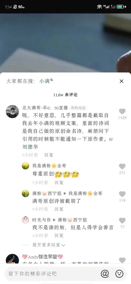 “北大满哥”表示,他的原创诗句和文案分别发布于2018年、2020年和2021年。“我相信德高望重的刘先生肯定不会来我的短视频,一个字一个字扒我的文案,然后去发一个商业广告。所以最好谁去扒的,谁出来帮我做一个解释。”
