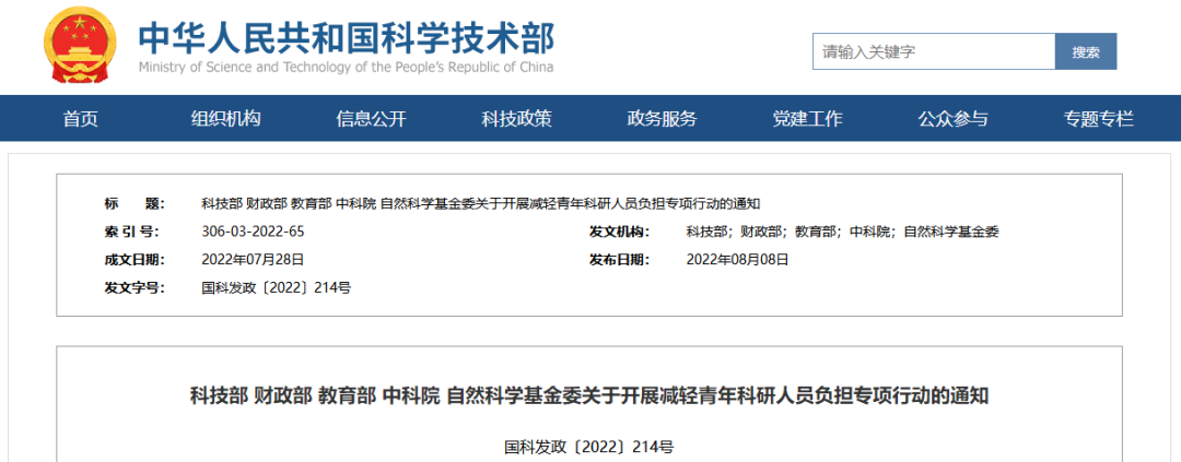8月8日,科技部、财政部等五部门发布《关于开展减轻青年科研人员负担专项行动的通知》。直面青年科研人员面临的崭露头角机会少、成长通道窄、评价考核频繁、事务性负担重等突出问题,文件亮出了行动内容的关键词——挑大梁、增机会、减考核、保时间、强身心。