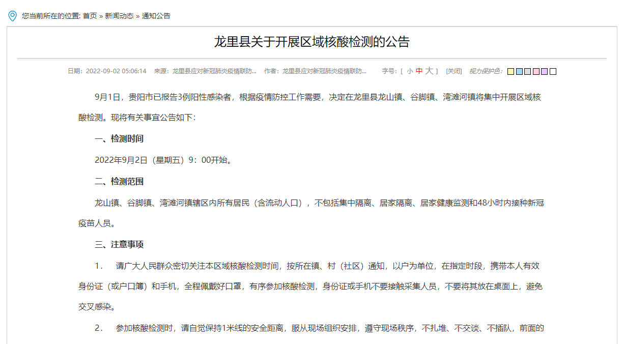 9月1日,贵阳市已报告3例阳性感染者,根据疫情防控工作需要,决定在龙里县龙山镇、谷脚镇、湾滩河镇将集中开展区域核酸检测。现将有关事宜公告如下: