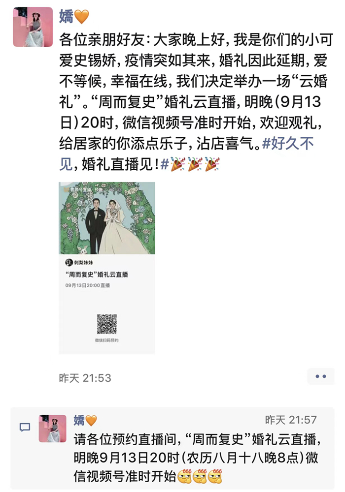 “疫情之下,原定于9月19日的线下婚礼无法如期举行。于是,我们昨晚突发奇想,决定办一场‘云婚礼’,给大家添点乐事,也把幸福传递给更多的人。”新娘史锡娇告诉记者,这场特殊的婚礼也得到了左邻右里的热心帮忙,大家贴心地为他们的婚礼送上了爱心物资,他们也早早地把准备好的喜糖,经过消毒杀菌后,由物业工作人员帮忙送到了邻居们手中。