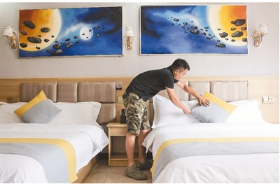 32岁的刘成亮在民宿内整理客房。2016年,刘成亮从前进村搬迁到航龙村星际家园,并将安置房用于经营民宿。目前,刘成亮所经营的民宿有14个房间,在每年的旅游旺季,入住率能达到百分之八十以上。