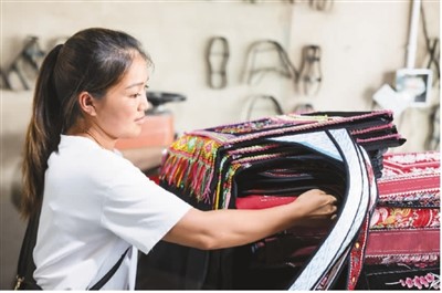 30岁的杨丽在克度镇马鞍社区一刺绣厂内工作。杨丽家是“中国天眼”所在“大窝凼”内的12户居民之一。2009年,杨丽家搬迁至克度镇的移民安置点。如今,杨丽在克度镇马鞍社区一刺绣厂内担任管理工作。