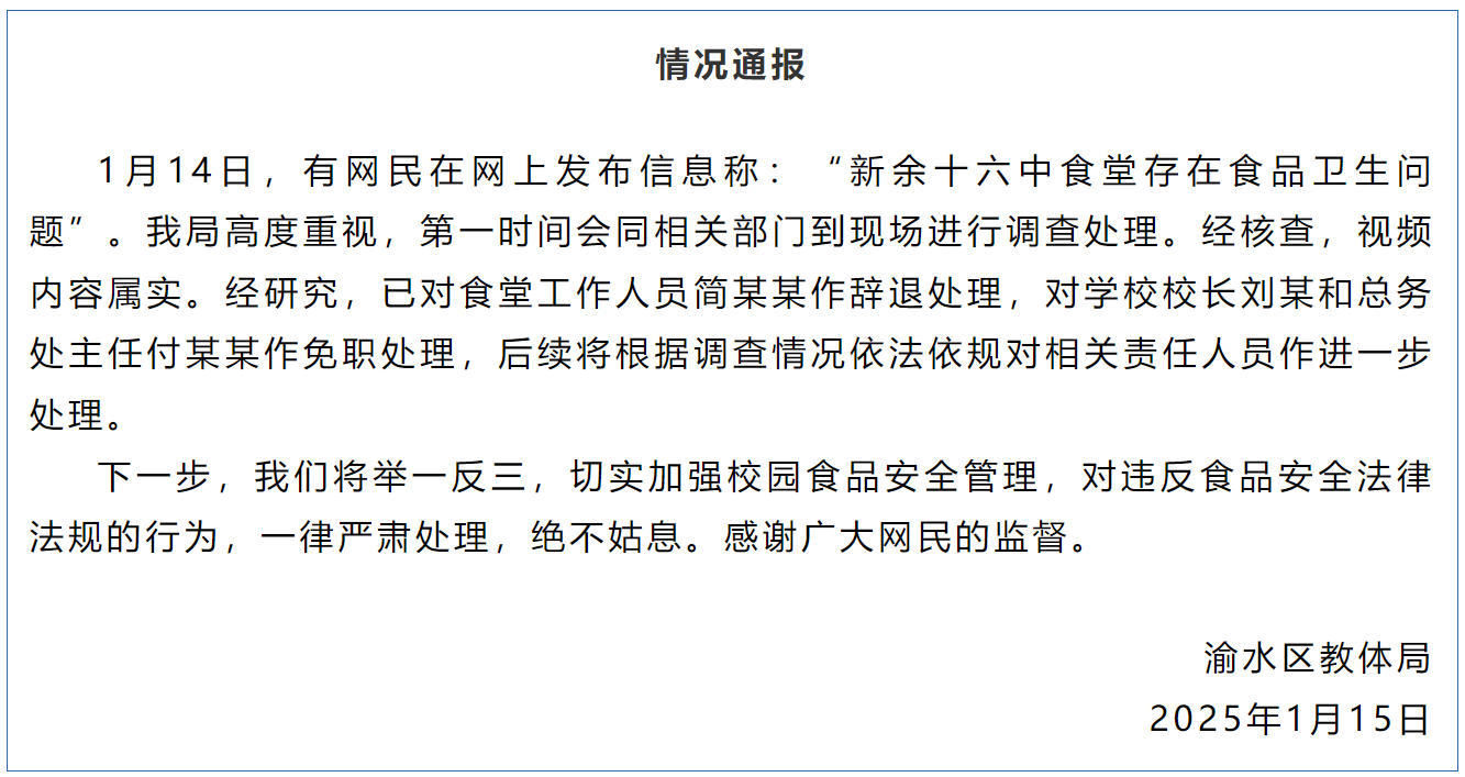 1月15日晚,“渝水发布”公众号发布《情况通报》: