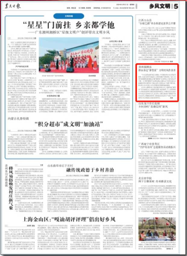 今天(3月21日),《农民日报》刊发新闻《贵州务川县镇南镇移风易俗焕发村庄新气象》。