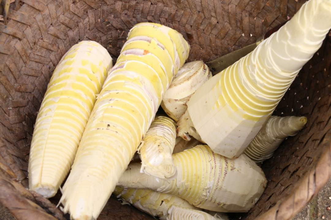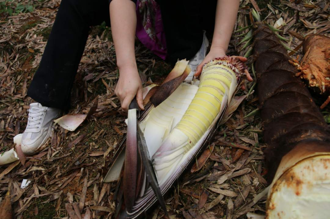媒体人与游客们背着背篓,扛着锄头,走进竹林,在竹农的指导下挖起了春笋。随着锄头落下,一个个春笋被挖出,用刀将春笋从中切开,剥去笋壳,削去笋膜,新鲜的春笋就变成了可食用的自然美味。