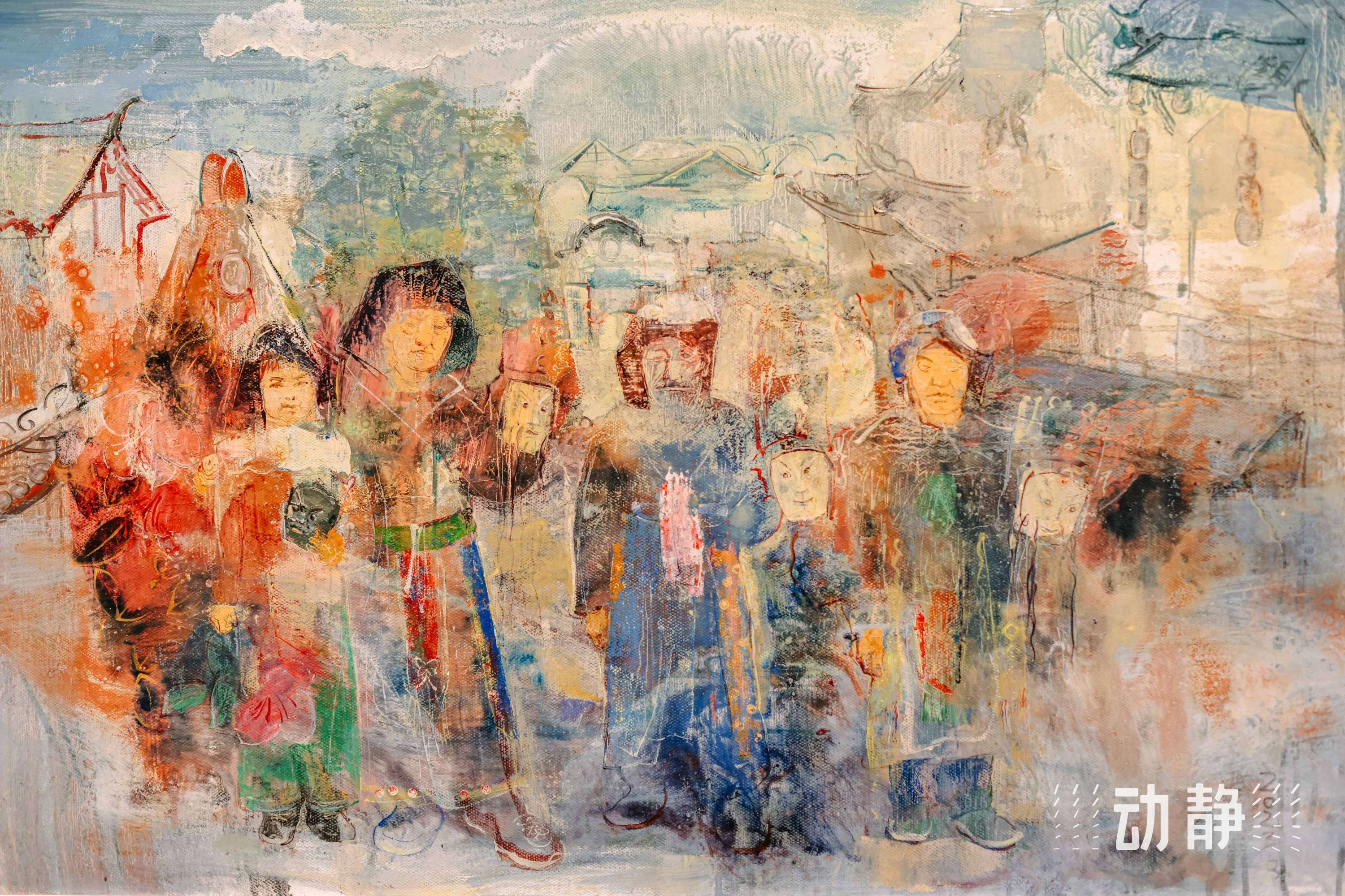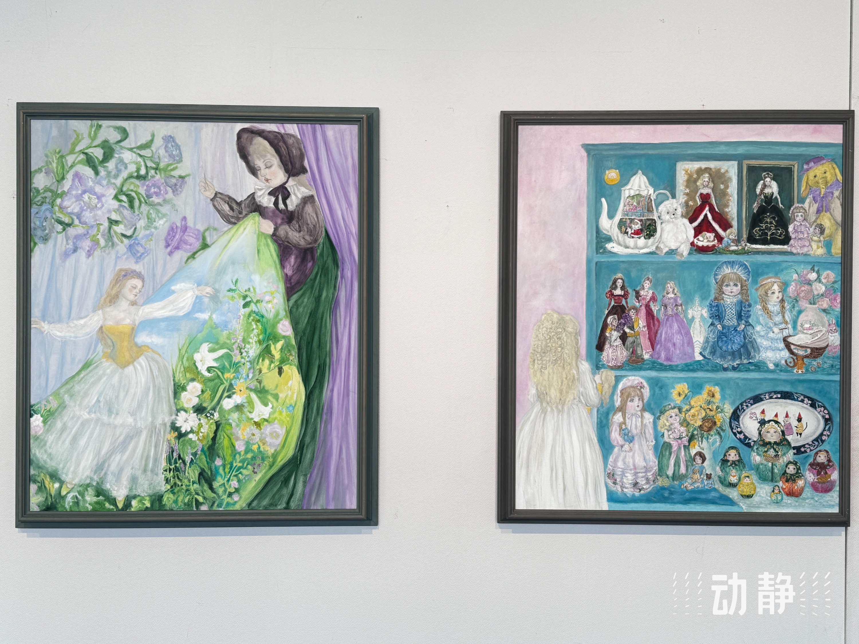 这幅布面油画的创作者叫李梦蝶,她对画的注解是,《我的好奇柜》是一个奇妙世界。各式娃娃栩栩如生的陈列其中,它们是童年的忠实伴侣,也是成长路上的见证者。每一个娃娃都承载着岁月的记忆,小小的空间里都是童真的成长的光影交错,李梦蝶希望为参观者带来一场关于纯真岁月和成长轨迹的绚丽画卷。