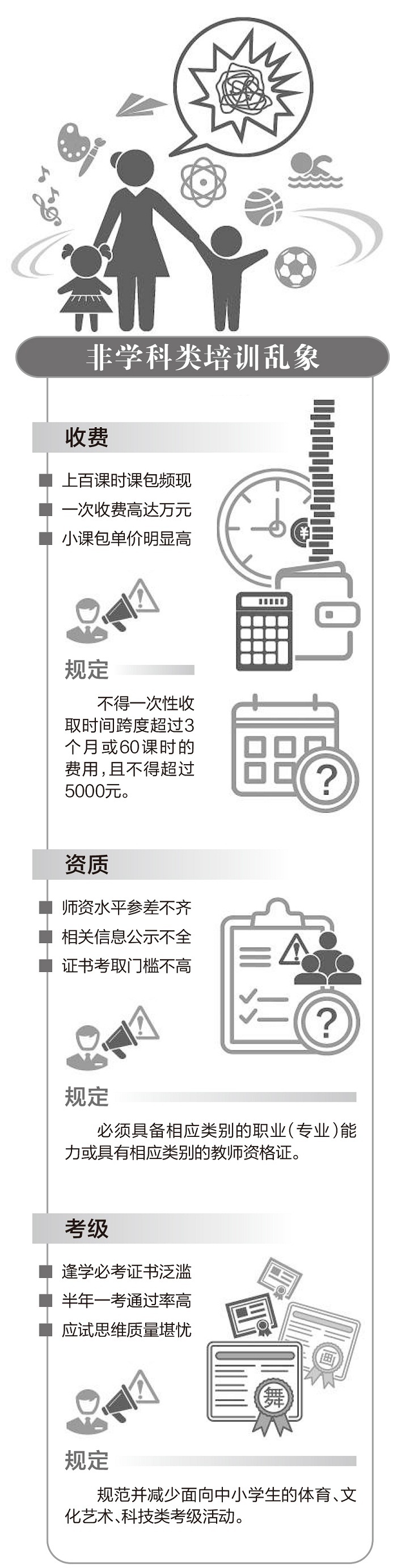 进入新学期,不少家长又开始考虑给孩子报班,五花八门的非学科类校外培训迅速升温。日前,教育部等十三部门印发了《关于规范面向中小学生的非学科类校外培训的意见》(以下简称《意见》),系统部署非学科类校外培训治理。记者调查发现,部分非学科类校外培训仍然存在收费乱、门槛低等问题。