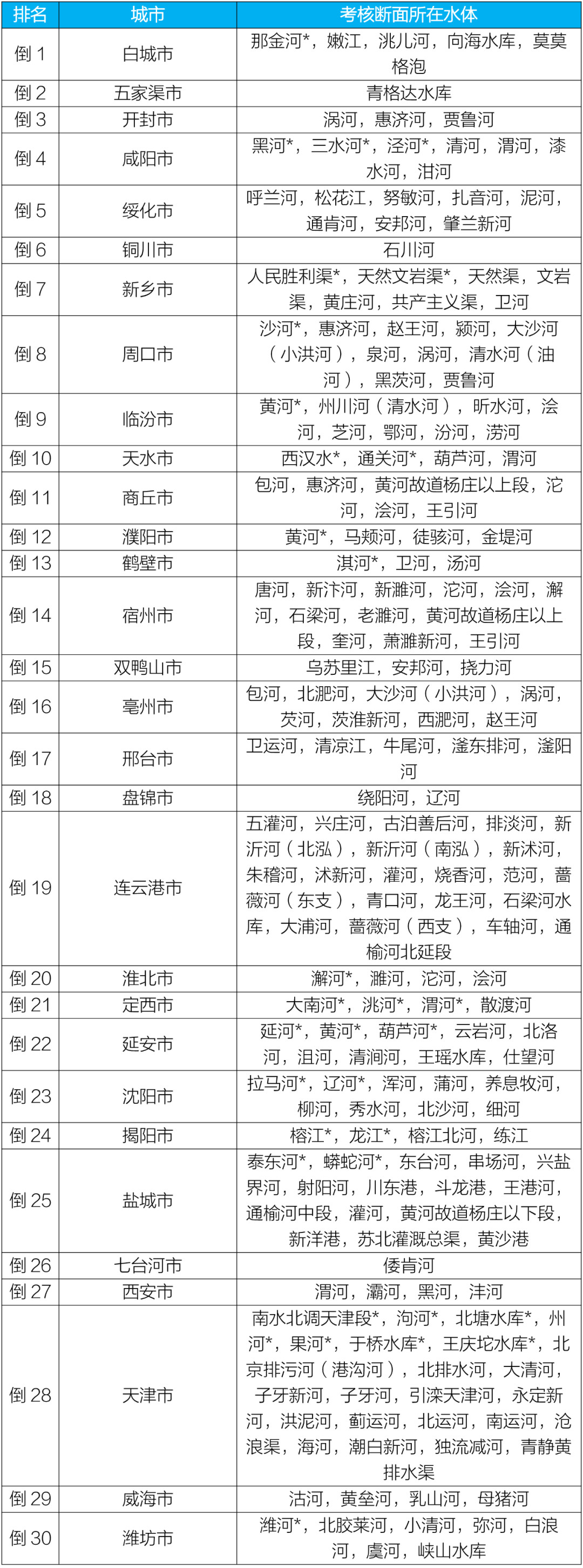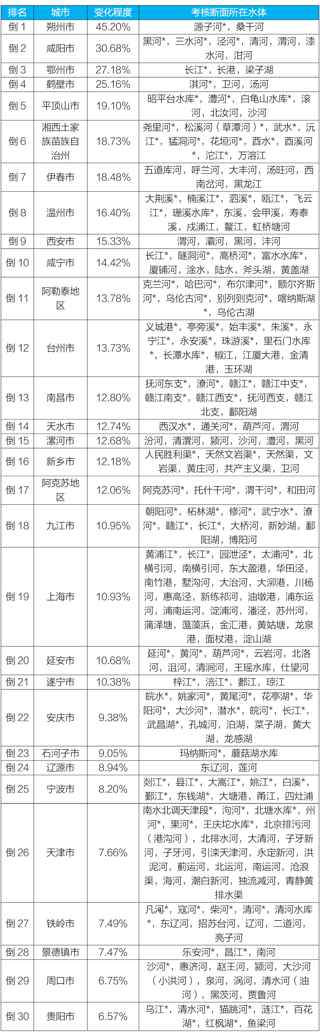 白城、那曲和运城等30个城市国家地表水考核断面水环境质量变化情况相对较好(从第1名至第30名),朔州、咸阳和鄂州等30个城市国家地表水考核断面水环境质量变化情况相对较差(从倒数第1名至倒数第30名)。