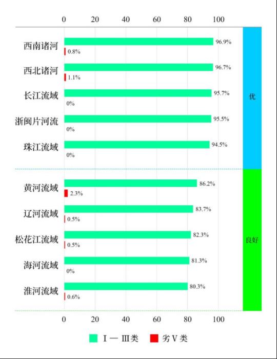1—3月,长江、黄河、珠江、松花江、淮河、海河、辽河等七大流域及西南诸河、西北诸河和浙闽片河流水质优良(Ⅰ—Ⅲ类)断面比例为90.3%,同比上升0.6个百分点;劣Ⅴ类断面比例为0.4%,同比下降0.4个百分点。主要污染指标为化学需氧量、五日生化需氧量和氨氮。其中,西南诸河、西北诸河、长江流域、浙闽片河流和珠江流域水质为优;黄河、辽河、松花江、海河和淮河流域水质良好。