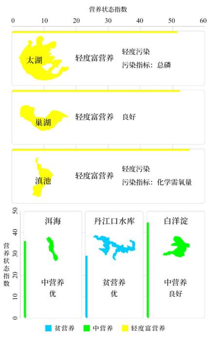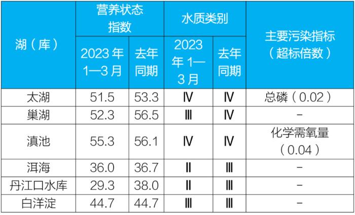 1—3月,监测的195个重点湖(库)中,水质优良(Ⅰ—Ⅲ类)湖库个数占比81.0%,同比上升2.9个百分点;劣Ⅴ类水质湖库个数占比4.6%,同比下降0.1个百分点。主要污染指标为总磷、化学需氧量和高锰酸盐指数。186个监测营养状态的湖(库)中,中度富营养的4个,占2.2%;轻度富营养的34个,占18.3%;其余湖(库)为中营养或贫营养状态。其中,太湖为轻度污染、轻度富营养,主要污染指标为总磷;巢湖水质良好、轻度富营养;滇池为轻度污染、轻度富营养,主要污染指标为化学需氧量;洱海水质为优、中营养;丹江口水库水质为优、贫营养;白洋淀水质良好、中营养。