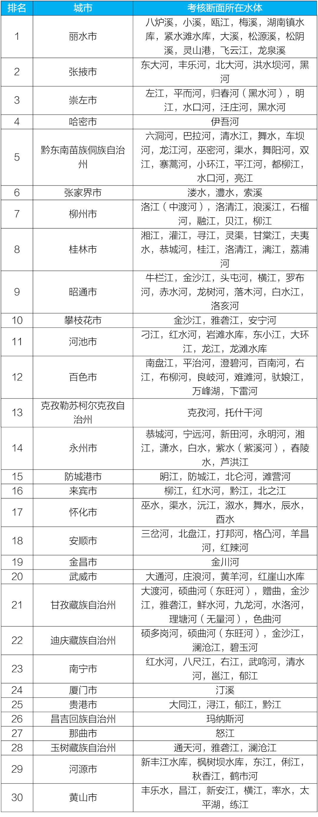 1—3月,全国地级及以上城市中,丽水、张掖和崇左等30个城市国家地表水考核断面水环境质量相对较好(从第1名至第30名),白城、五家渠和开封等30个城市国家地表水考核断面水环境质量相对较差(从倒数第1名至倒数第30名)。
