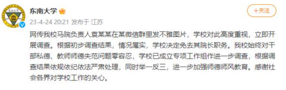 央视网消息:据东南大学,网传我校马院负责人袁某某在某微信群里发不雅图片,学校对此高度重视,立即开展调查。根据初步调查结果,情况属实,学校决定免去其院长职务。