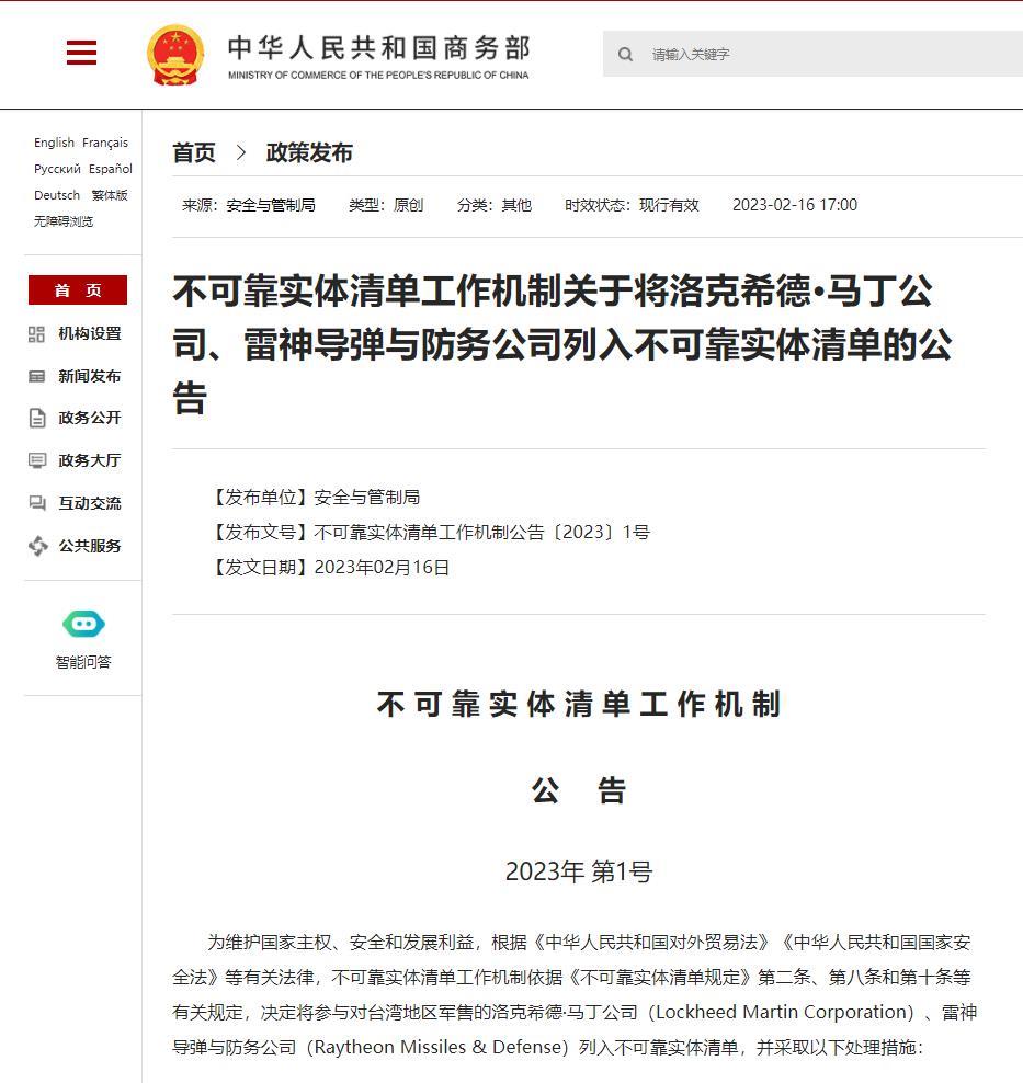 为维护国家主权、安全和发展利益,根据《中华人民共和国对外贸易法》《中华人民共和国国家安全法》等有关法律,不可靠实体清单工作机制依据《不可靠实体清单规定》第二条、第八条和第十条等有关规定,决定将参与对台湾地区军售的洛克希德·马丁公司(Lockheed Martin Corporation)、雷神导弹与防务公司(Raytheon Missiles & Defense)列入不可靠实体清单,并采取以下处理措施:
