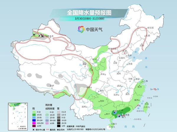 明天,新疆沿天山地区、西藏南部、川西高原南部等地部分地区有小到中雪或雨夹雪,其中,新疆沿天山地区局地有大雪。甘肃南部、宁夏、西藏东南部、四川南部、贵州大部、江南东部和南部、华南、台湾岛等地部分地区有小到中雨,其中,广西东部、广东西部和南部沿海等地部分地区有大雨。