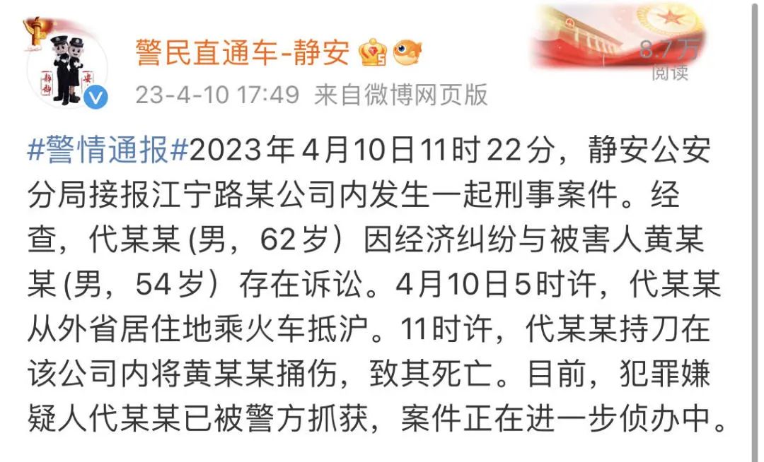 据通报,2023年4月10日11时22分,静安公安分局接报江宁路某公司内发生一起刑事案件。经查,代某某(男,62岁)因经济纠纷与被害人黄某某(男,54岁)存在诉讼。4月10日5时许,代某某从外省居住地乘火车抵沪。11时许,代某某持刀在该公司内将黄某某捅伤,致其死亡。