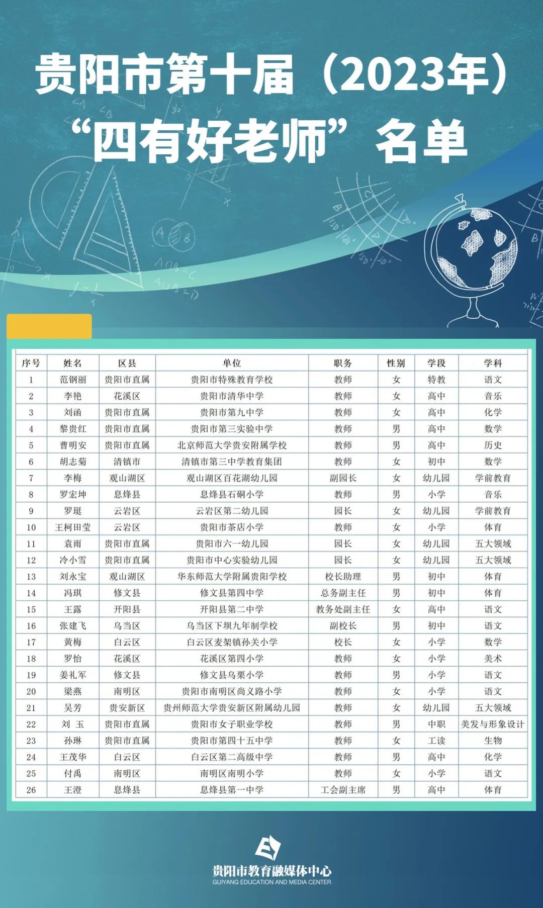 5月6日,贵阳市教育局公布了贵阳市第十届(2023年)“四有好老师”评选结果名单,并于2023年5月6日至2023年5月9日进行名单公示。