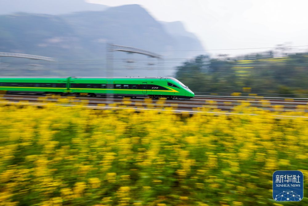 3月10日,复兴号动车组开行在新成昆铁路上,铁路附近的油菜花吐露芬芳。新华社记者 沈伯韩 摄