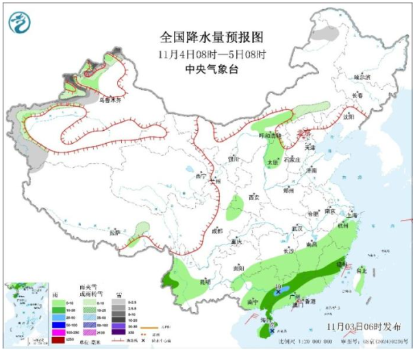 据中央气象台网站消息,11月3日,中央气象台主要关注西南至江南、华南一带的降雨以及海上大风可能带来的影响。此外,11月5日起将有一股较强冷空气自西向东影响我国,公众需关注预报信息。