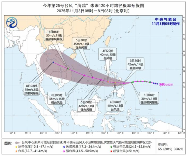 部分海域风力较大。目前,冷空气对内蒙古及东北地区的影响已趋于结束,今天气温将开始回升。随着冷空气入海,未来三天,东海、台湾海峡、南海北部等海域将有6~8级风、阵风9~10级。今年第25号台风“海鸥”(强热带风暴级)4日穿过菲律宾中部,5日将移入南海东南部海面,强度逐渐加强,最强可达强台风级(42~50米/秒,14~15级),逐渐趋向于越南中部沿海。受其影响,5日至7日,南海中南部及中沙群岛、南沙群岛和西沙群岛将有明显风雨天气。在相关海域航行、作业的船舶需关注“海鸥”移动趋势,避开大风区域。