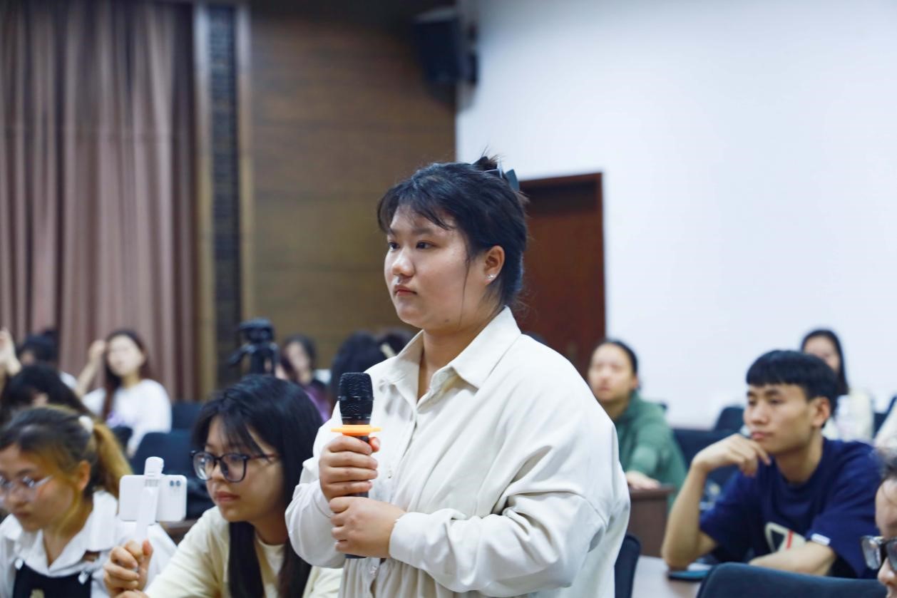 在模拟新闻发布会现场,策展人陈若龄在省博学术报告厅接受新闻学专业学生的集体采访,解答学生们提出的种种问题。活动一经开始,两个班级的学生积极举手,每个学生都非常珍惜自己抢到的提问机会,一次举手,连连发问。